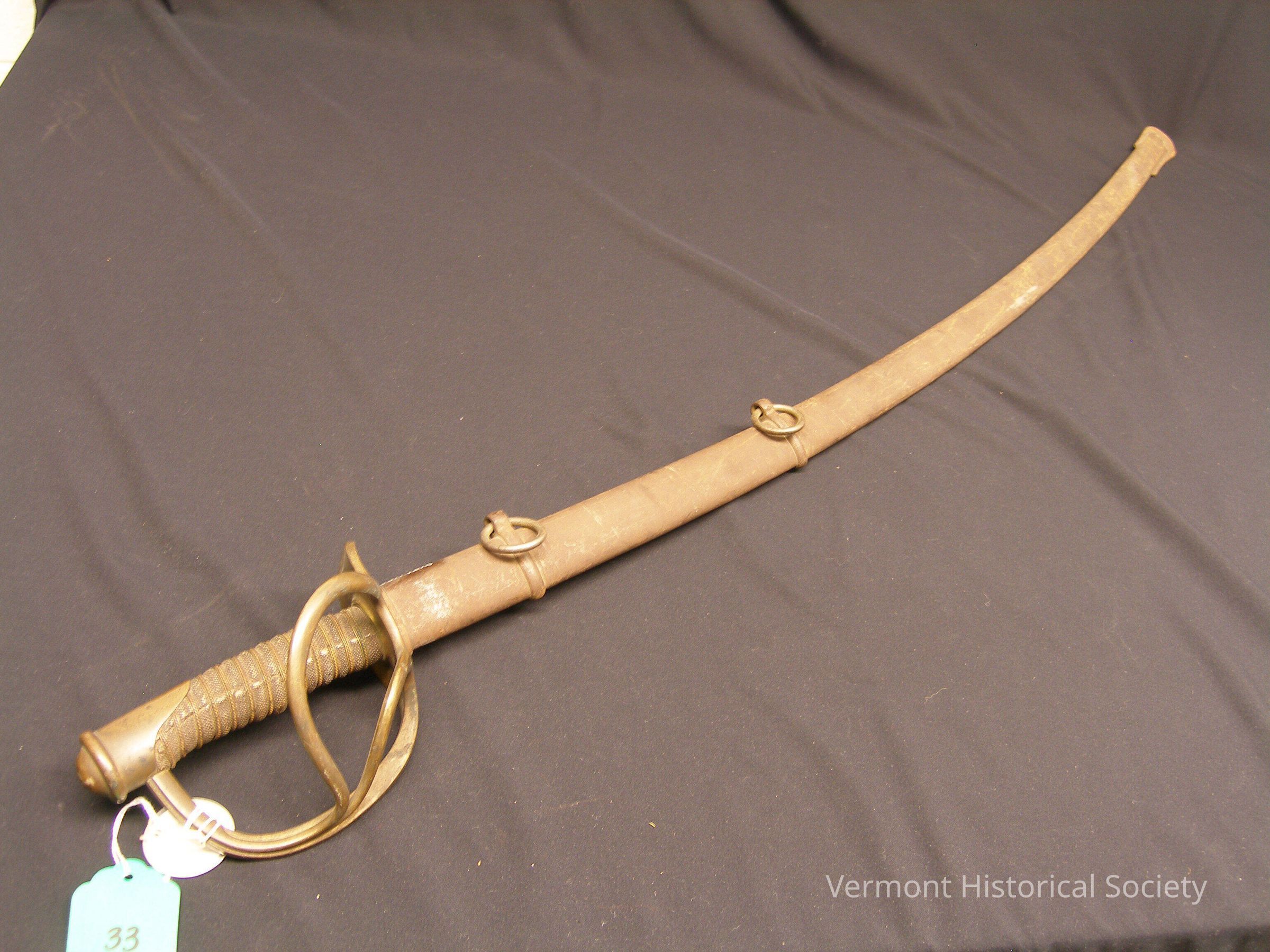 Saber with scabbard. The grip is shagreen accented with twisted wire. The guard is engraved, "W. Wells, Co. C. 1st Reg. Vermont Cavalry". The blade is engraved with a decorative floral pattern and the mark, "C. Roby & Co., W. Chlennston, Mass."Context