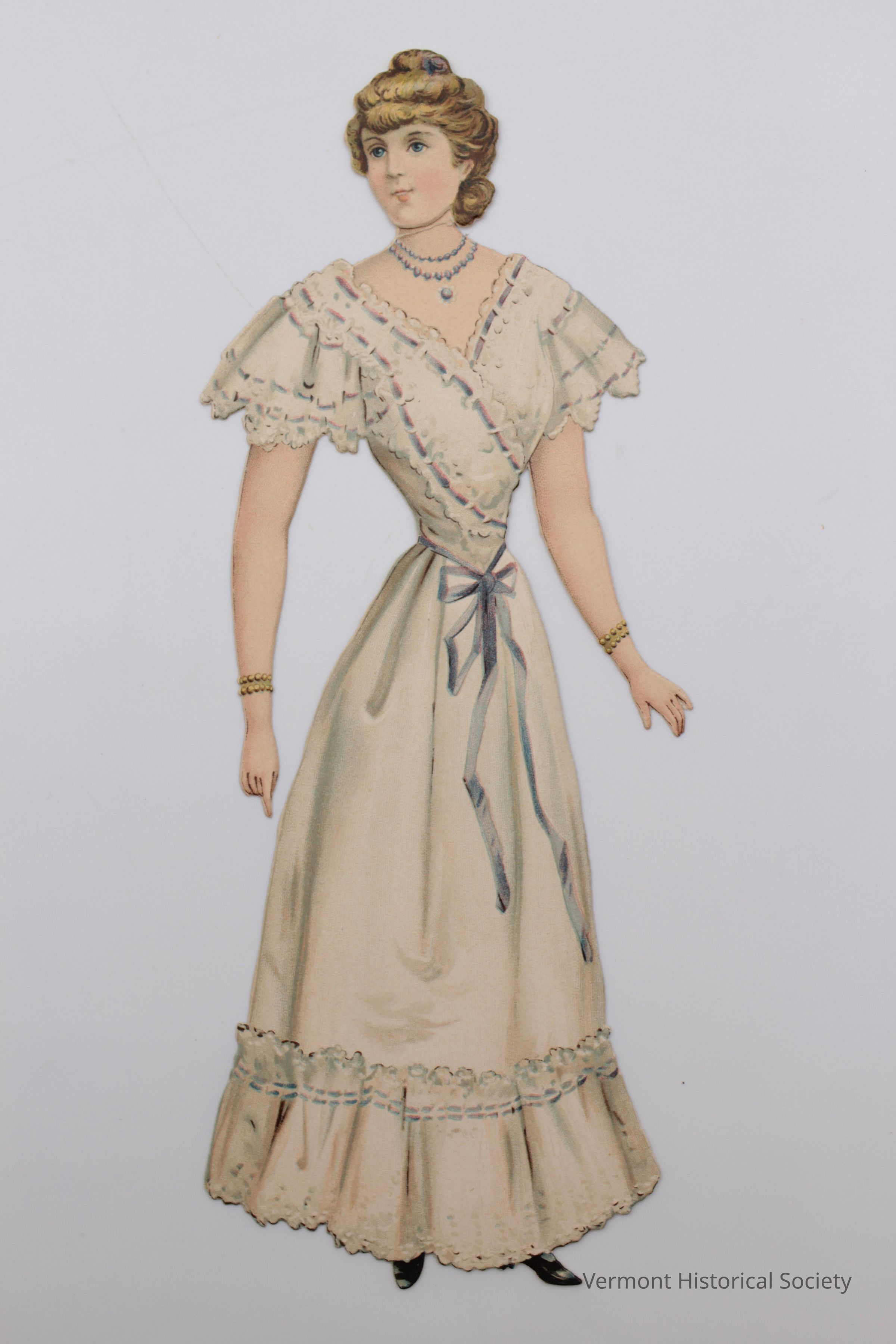 Paper doll made of cardstock showing a woman in a corset cover and petticoat. The corset cover is elaborately flounced and decorated with lace and ribbon, and there is a matching flounce of lace and ribbon at the hem of the petticoat. She is wearing two blue beaded necklaces, and two gold beaded bracelets on each wrist. The head attaches on the reverse to a long neck (now detached), allowing the chin to hang over clothing. The hair is light brown and held in a top knot. There is a rectangular cardstock tab on the reverse that allows the doll to be propped standing up. The back is printed with trademark information and the label, "ARTISTIC SERIES XIV".Context