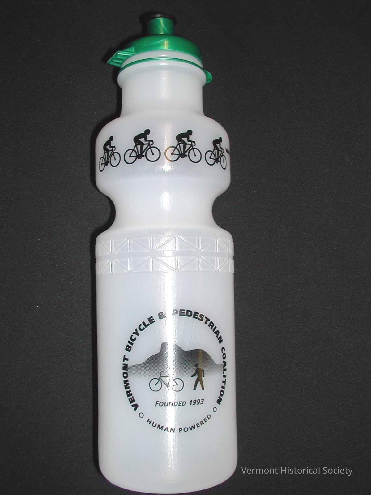 White plastic water bottle with a green and black spouted lid. The lid is molded with the label, "California Springs Duo Flow Made in U.S.A." Imprinted in black around top section of the bottle is a row of silhouettes of people on bicycles and the label, "www.vtbikeped.org". Imprinted below on one side is an image of bicycle and a cyclist against a mountain backdrop labeled "Founded 1993", with the words, "VERMONT BICYCLE & PEDESTRIAN COALITION Human Powered", printed around it in a circle. The other side of the bottle is printed with the words, "VERMONT BICYCLE & PEDESTRIAN COALITION Your voice for better bicycling and walking in Vermont."Acquisition