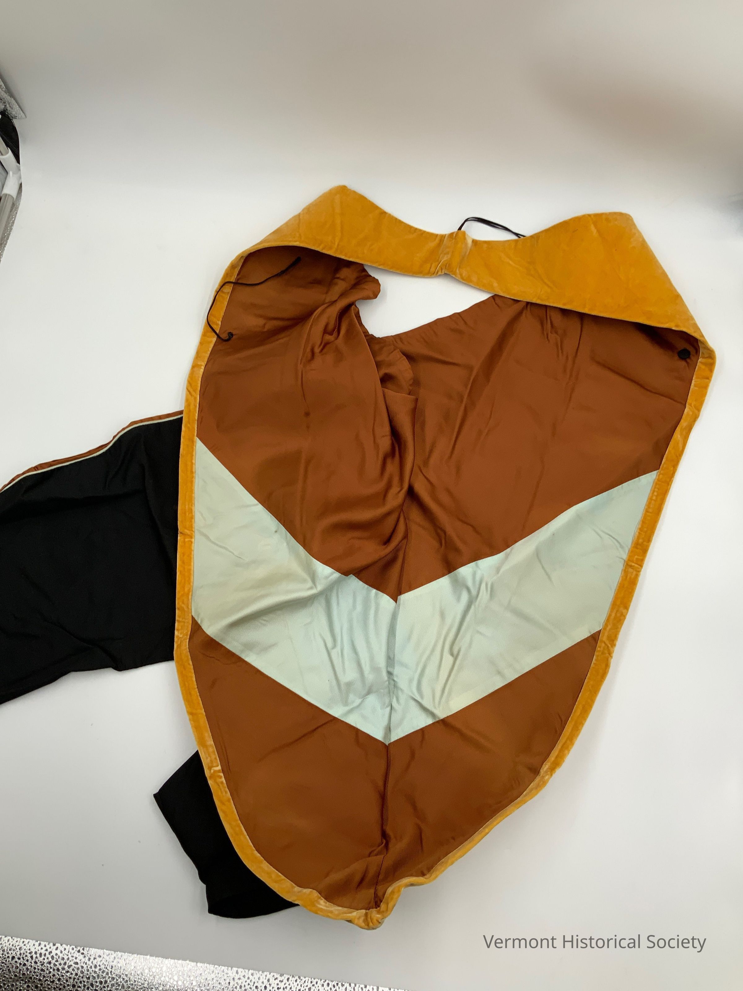Academic hood. The outer fabric is black, and the lining is copper with a white stripe. The opening edge is bound with gold-colored velvet.