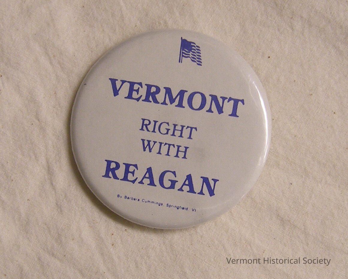 Round white button with safety clasp. At the very top of the pin is a waving American flag printed in blue. Underneath the flag, in the center of the pin, are the words "VERMONT / RIGHT / WITH REAGAN" in blue. At the very bottom in tiny print are the words "By Barbara Cummings, Springfield, Vt."
