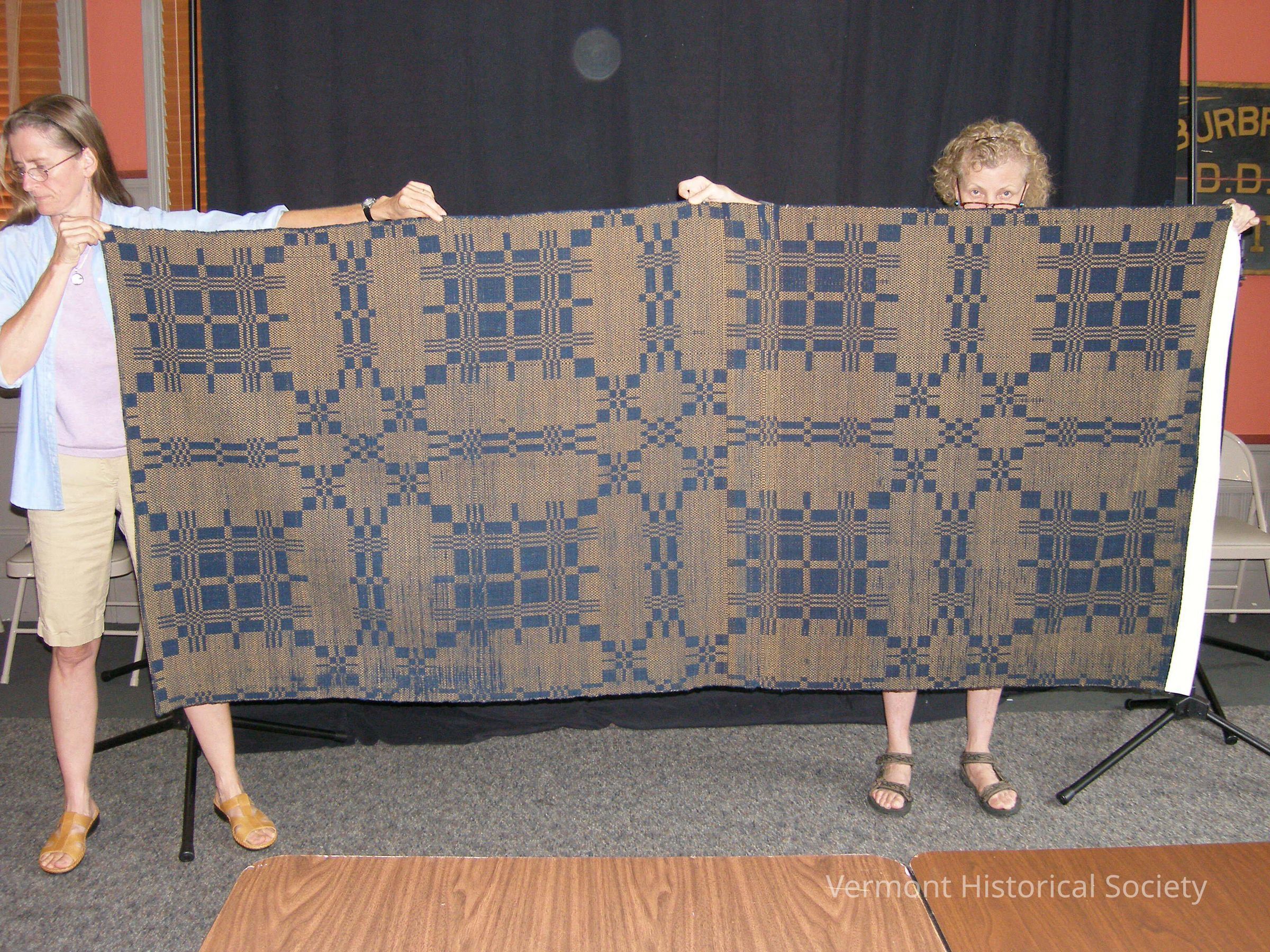 Single panel of a brown and blue summer-and-winter coverlet. The two short edges are hemmed, and there are several weaving errors throughout.Context
