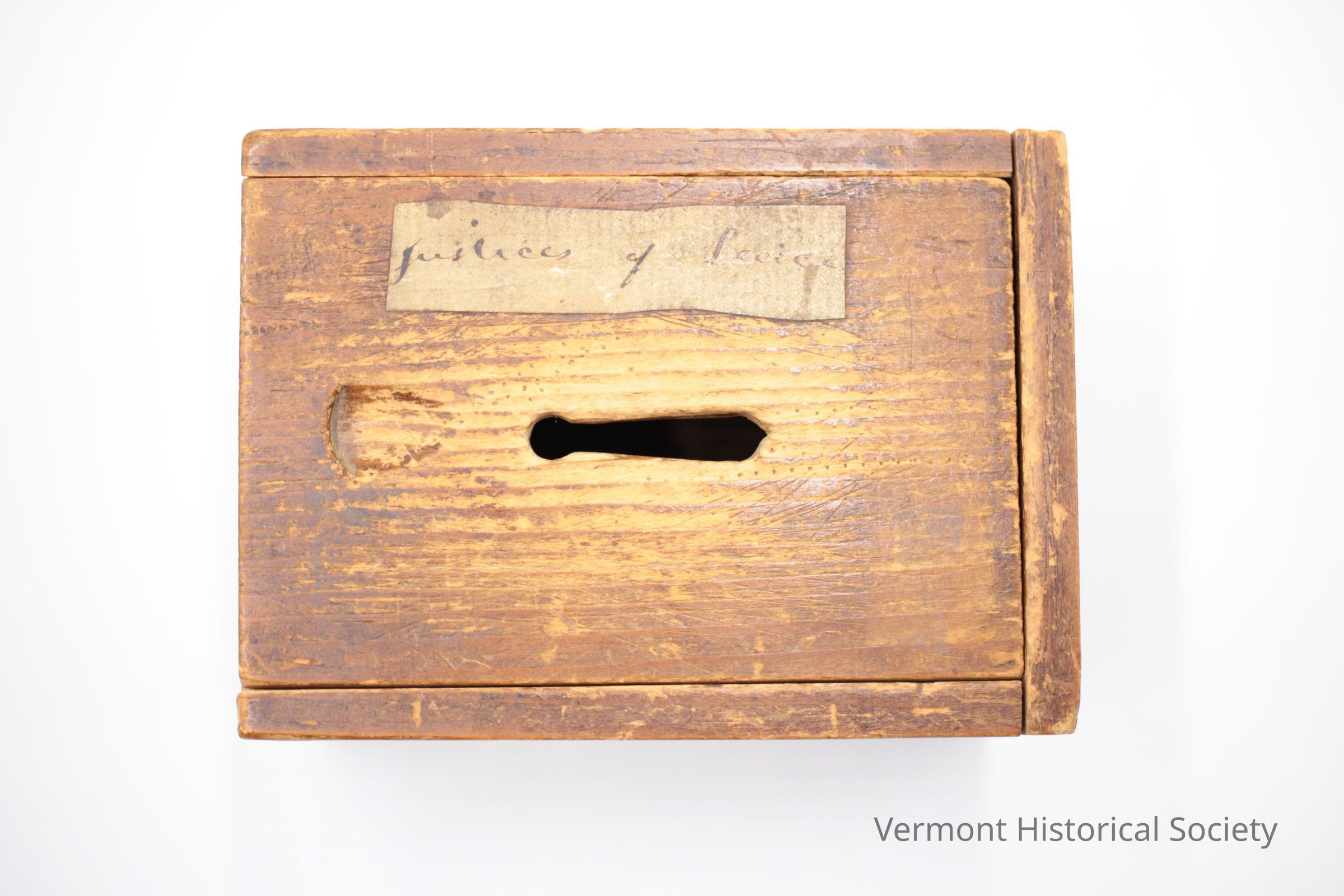 Small wooden ballot box. The box consists of two parts: a four-sided base and a slide-out top. One side of the base of the shorter than the rest, and the top slides through the gap and into a groove cut into the interior of the remaining three sides. There is a keyhole slot in the center of the top piece, and a thumb indentation for sliding the lid open. A rectangular piece of a paper is attached to the lid with the inked inscription, "Justices of the Peace".