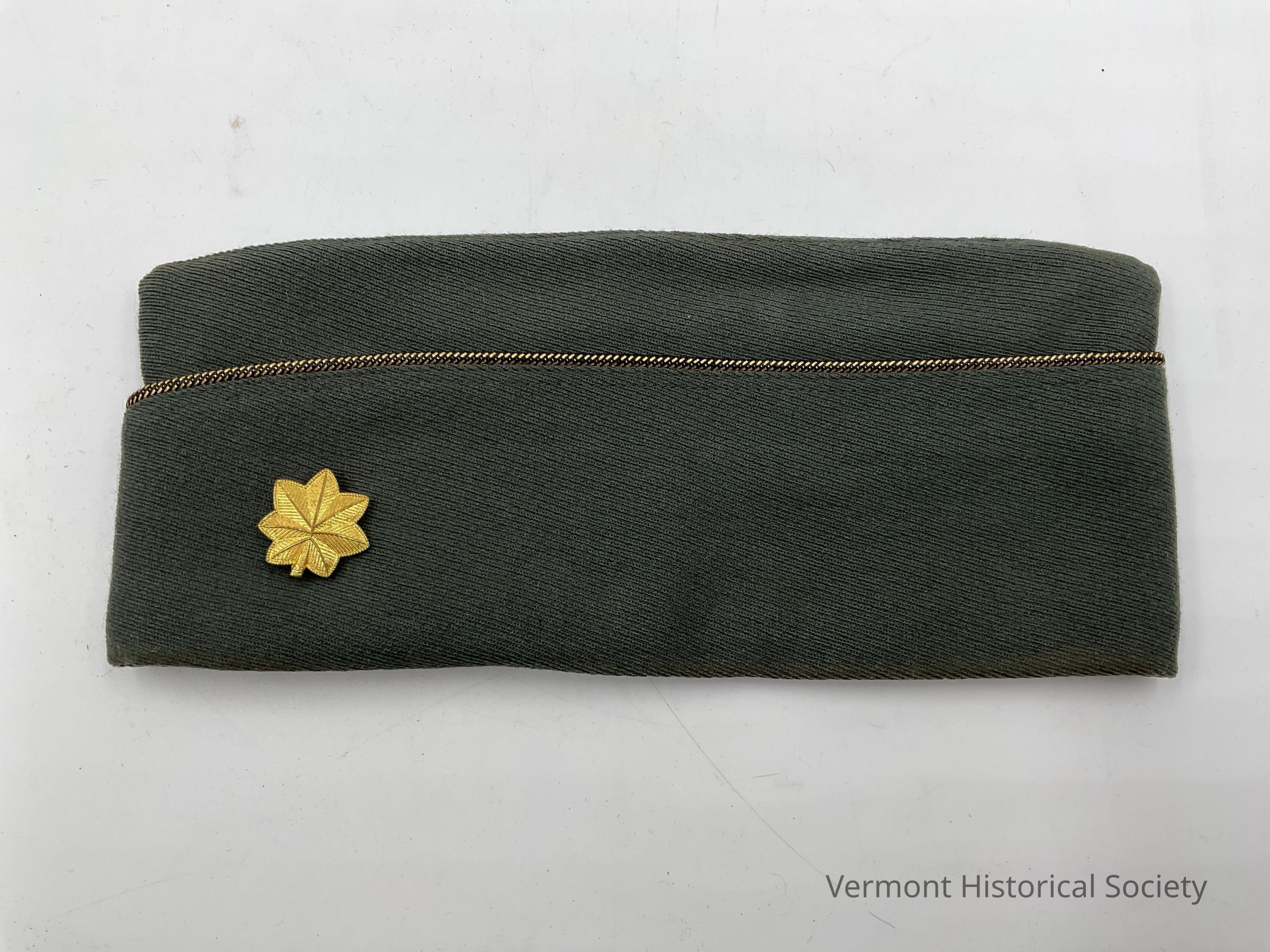 This hat was worn by Lawrence Rossi (1918-2025) of Barre during military service. He spent three years in the Pacific Theater during WWII, serving as a 1st Lieutenant with the Army's 172nd Infantry. After he was discharged in 1946 he continued to serve in the Vermont National Guard and was reactivated to serve in the Korean War. He retired as a Major from the Vermont National Guard in 1963.Acquisition