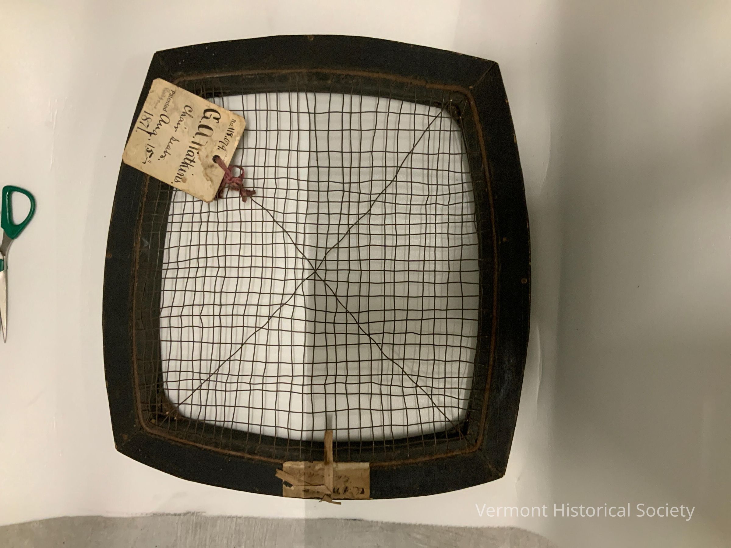 Patent model of a chair based. The model consists of a rounded square wooden frame with a groove near the inner edge. A mesh made of heavy wire is secured in the groove. The mesh is woven from wire in a plain weave, crossing every 1/2-inch. There are wires extending diagonally between each corner. There is a paper label on the frame that reads, "G. A. Watkins / Exhibit H.C.". There is a paper tag tied with pink ribbon to the wire mesh that reads, "No. 118.079. / G.A. Watkins. / Chair Seats. / Patented Aug. 18th 1871."Context