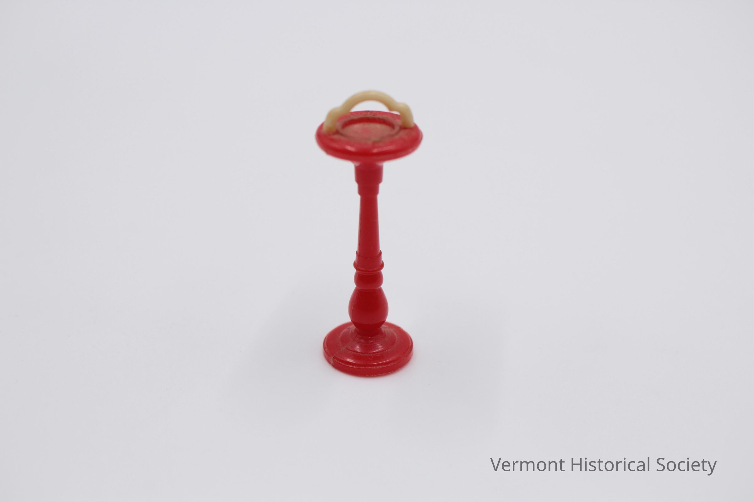 Miniature plastic ashtray on stand. The stand consists of a red plastic pedestal with a round base and top. A cream handle crosses the center top, and there is a clear, round insert beneath the handle. The top is molded with the words, "RENWAL U. S. A. / NO. 13".Context