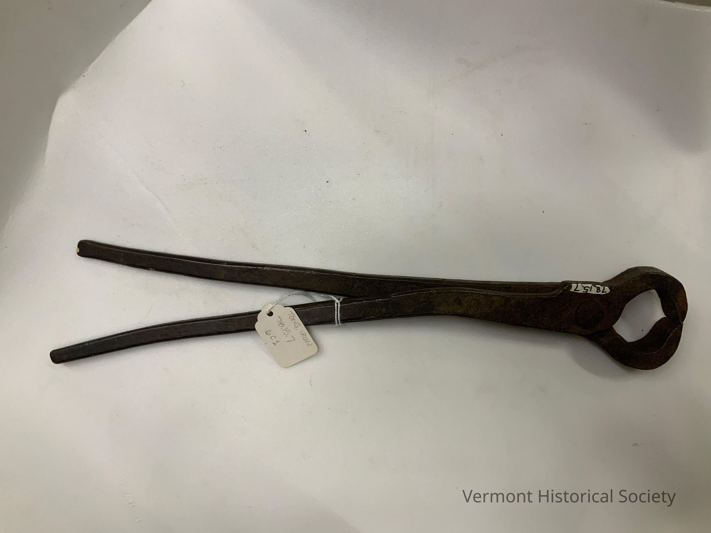 Metal tongs. The handle is two warped tongs with the two sides curve outward and straighten and overlap one another. The hinge intersects the two tongs and flares into rounded arms which overlap at the points. There are no markings and it is rusted.
