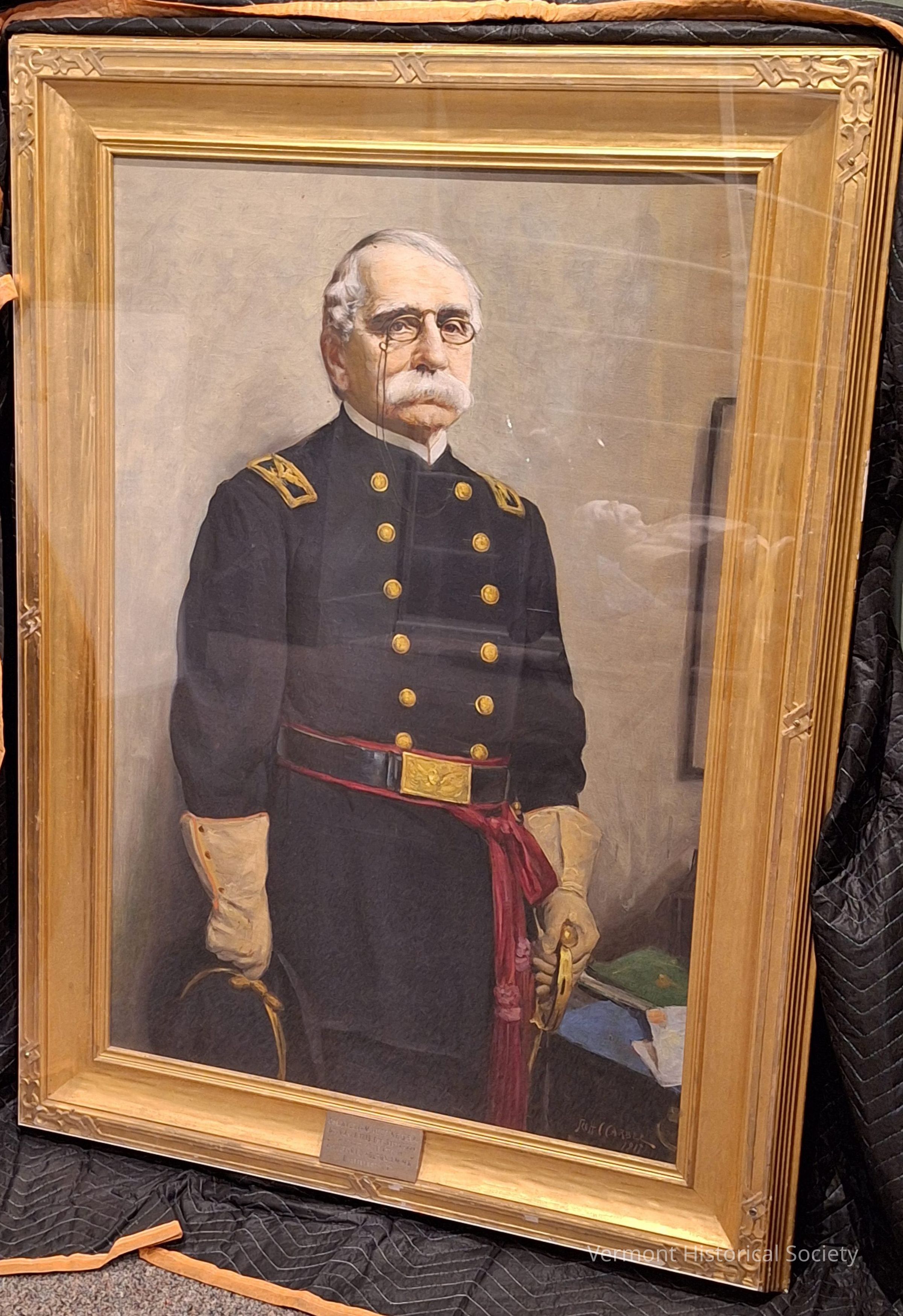 Oil on canvas portrait of Colonel William Austine. The Colonel stands in a simple interior space with a pale gray/green wall behind him. He is wearing glasses and his dress uniform with simple rectangular epaulettes, tan gloves, crimson sword belt and black belt over top with gold buckle. He holds his sword in his left hand and black hat with gold band in his right. There is a painting on the wall just behind his left shoulder, and a stack of books and papers on a desk by his left hand. The painting is signed "Scott C CARBEE 1917" in the lower right corner and rests in a simple geometric-carved gilt frame. There is a name plate attached to the bottom center of the frame that reads, "COL. WILLIAM AUSTINE, U.S.A. / BORN JAN. 8, 1815, DIED, SEPT. 4, 1904 / PORTRAIT PRESENTED BY / HON. HENRY D. HOLTON A.M., M.D. / BRATTLEBORO, VT."Type of Painting