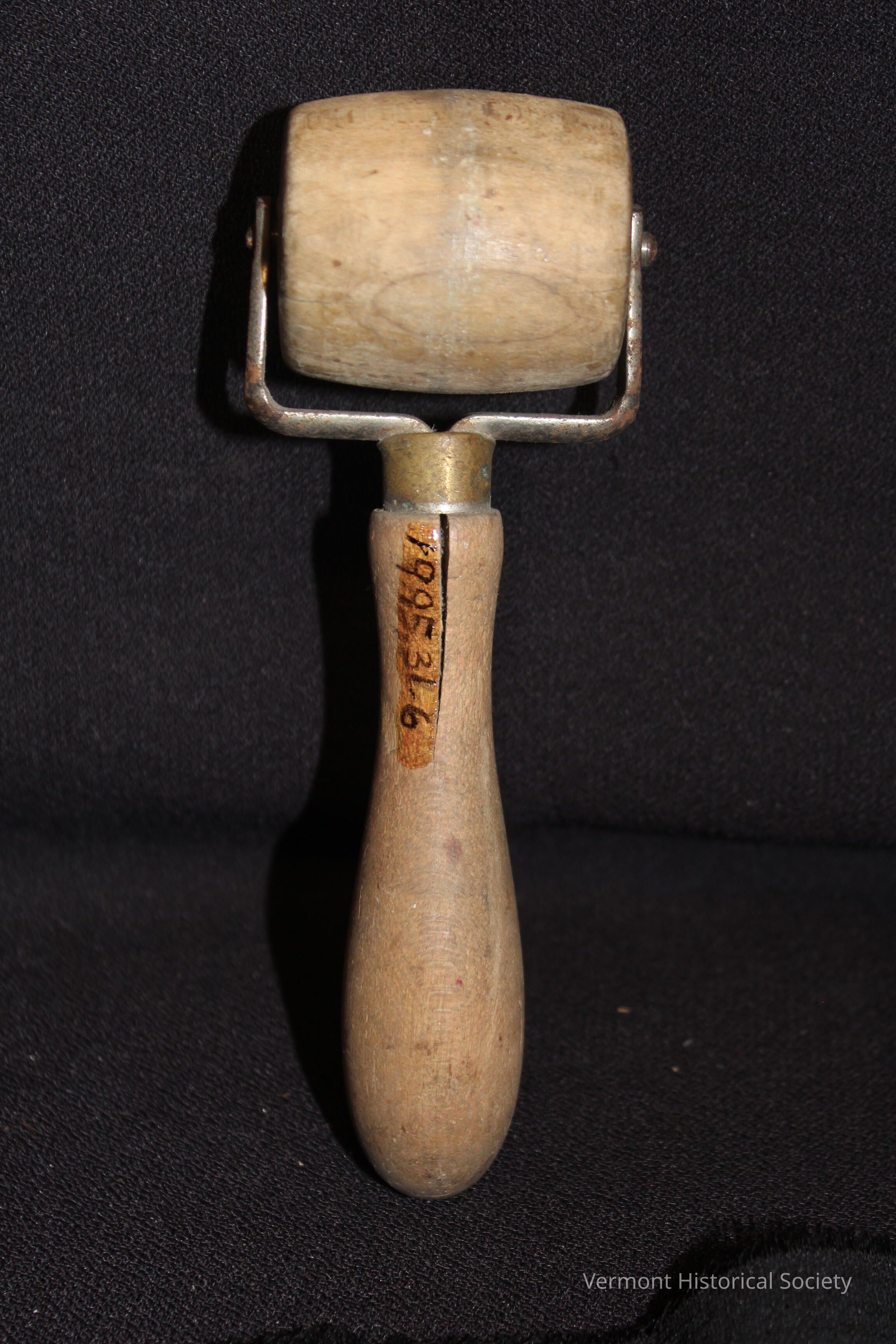 Small wooden wallpaper roller consisting of a turned wooden handle with a U-shaped metal bit inserted in one end with a roller between the spokes.