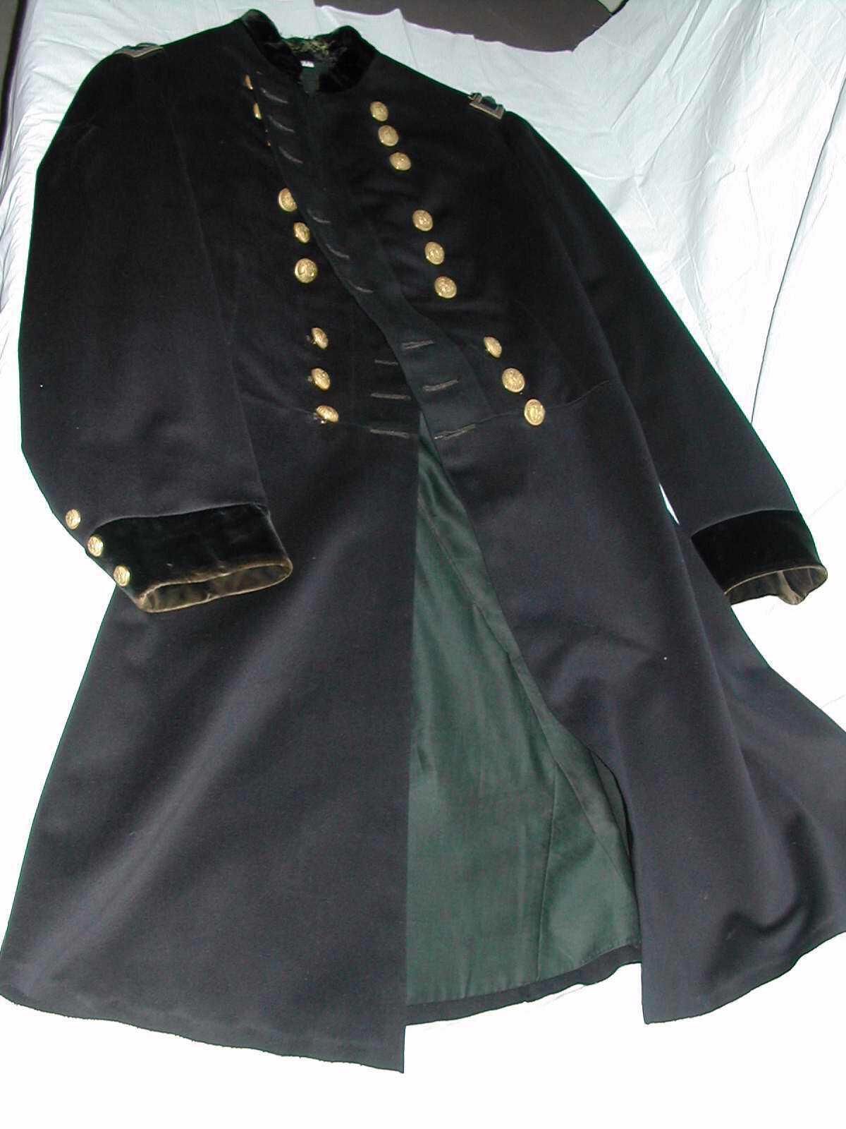 Long blue wool coat. The coat secures up the center front with two rows of nine brass buttons each. The buttons are separated into groups of three. The collar and sleeve cuffs are accented with black velvet. There are two rectangular shoulder straps outlined with gold braid and appliqued with two gold stars each. The coat is lined with blue silk satin.Context