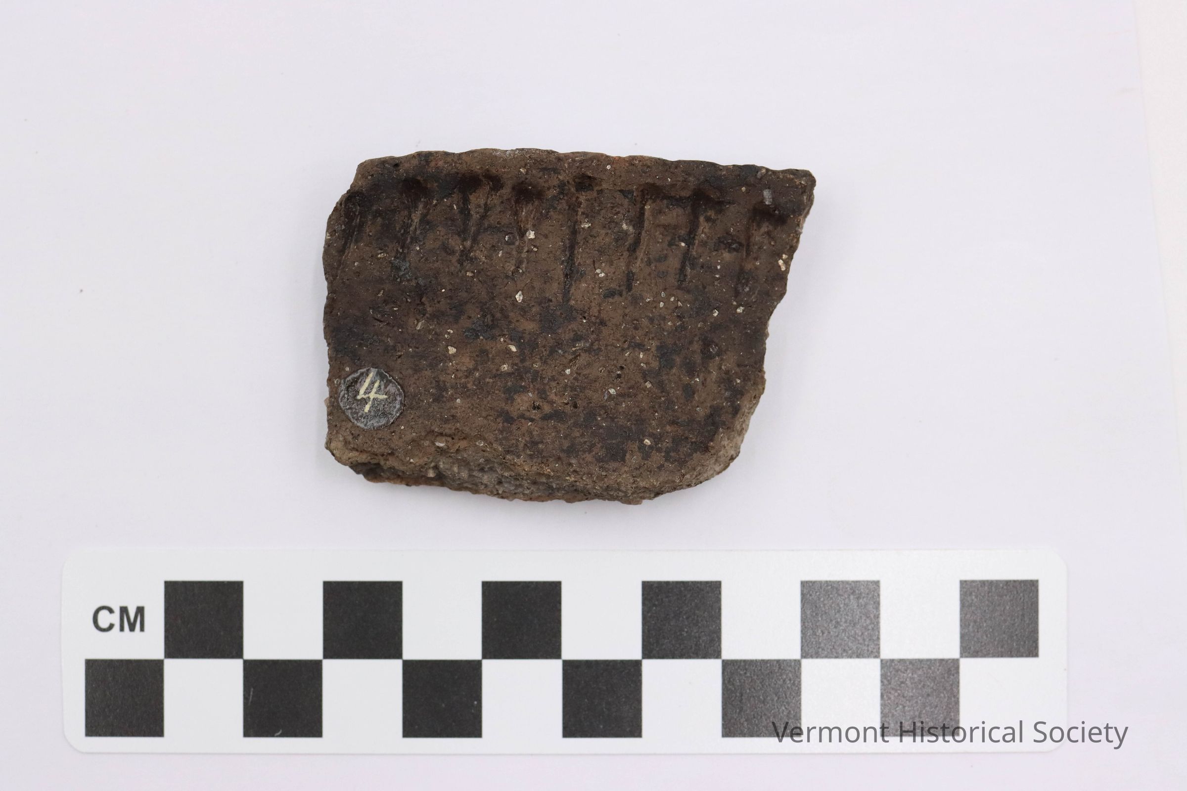 Pottery sherd with vertical dragged triangular punctations circling the rim and a scalloped lip.