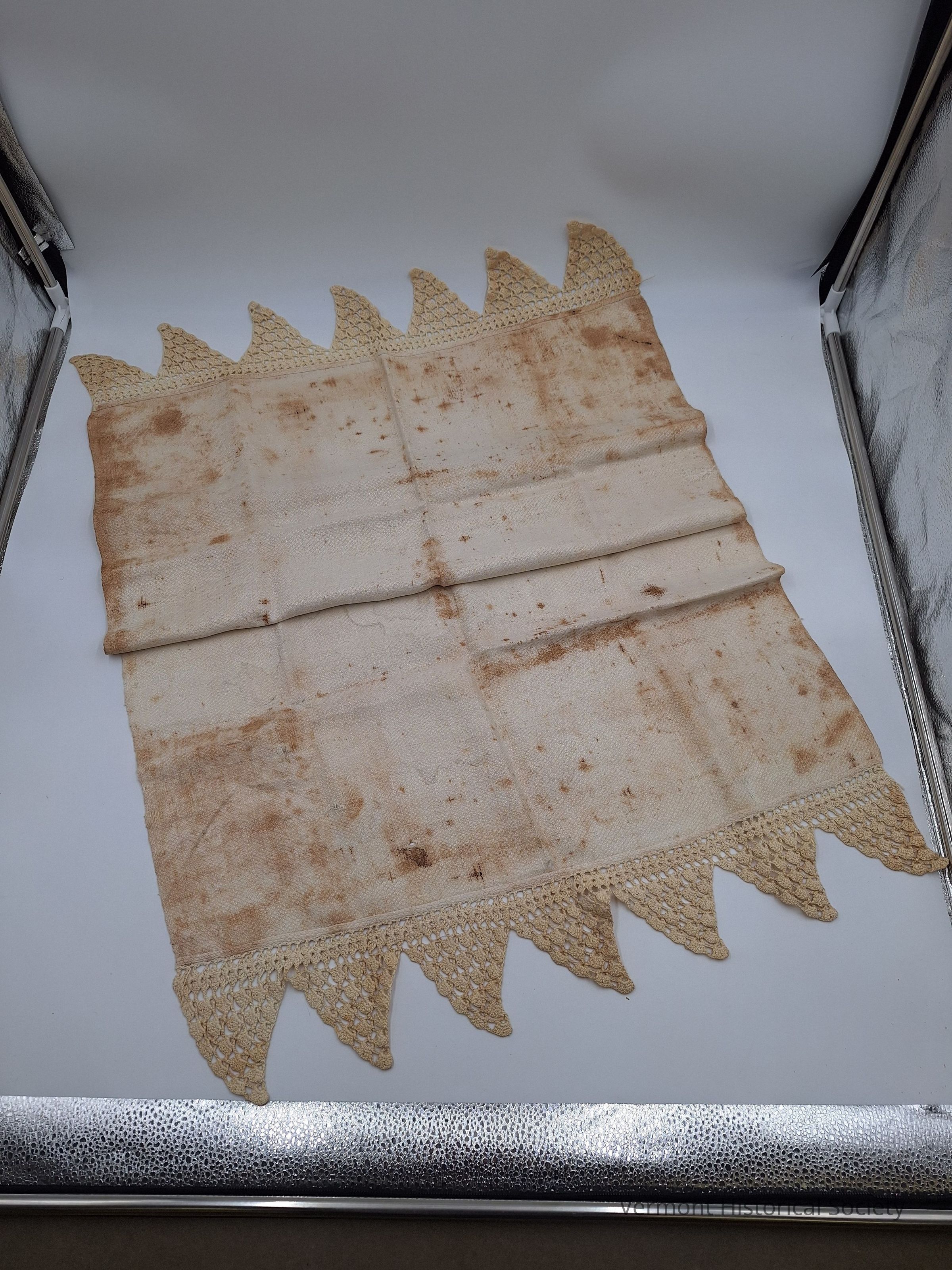 The flax for this runner was grown, harvested, spun, and woven/knit on the Davis family farm in Albany, Vermont, in the mid-19th century.Acquisition