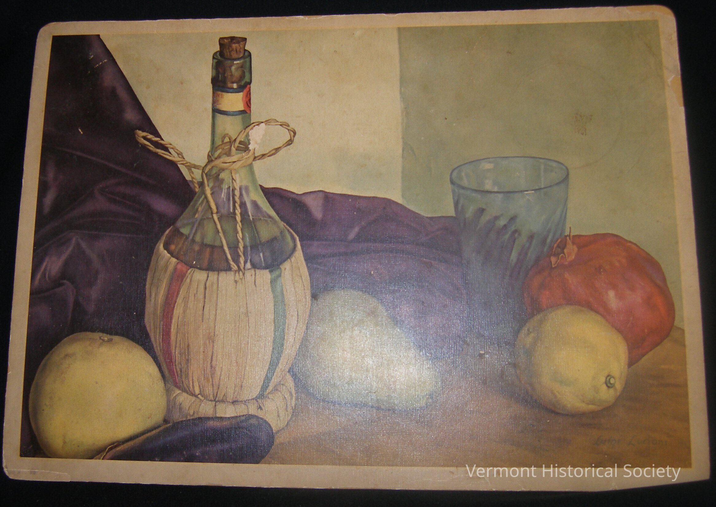 The placemat features a still life artwork by Luigi Lucioni titled "The Wine". The image depicts a wine bottle wrapped in raffia, a blue tumbler, five pieces of fruit, and a piece of deep purple velvet in the background. The back of the placemat is made of cork and there is a paper label located in the lower left corner of the back.