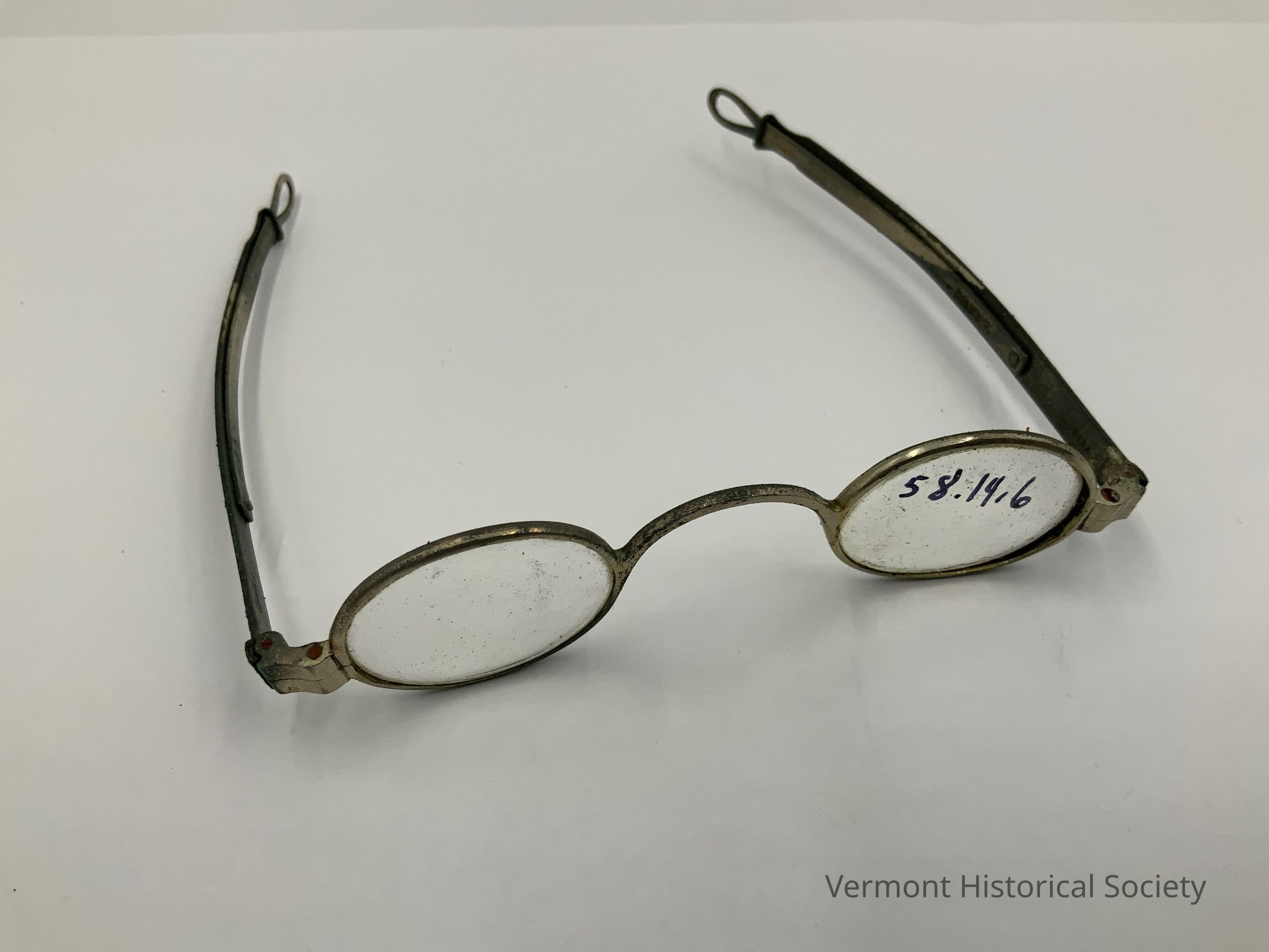 Metal framed eyeglasses with clear oval lenses. The temples are constructed in 2 parts and extend outward to lengthen. One of the temples is stamped with the mark, "TM&CO".
