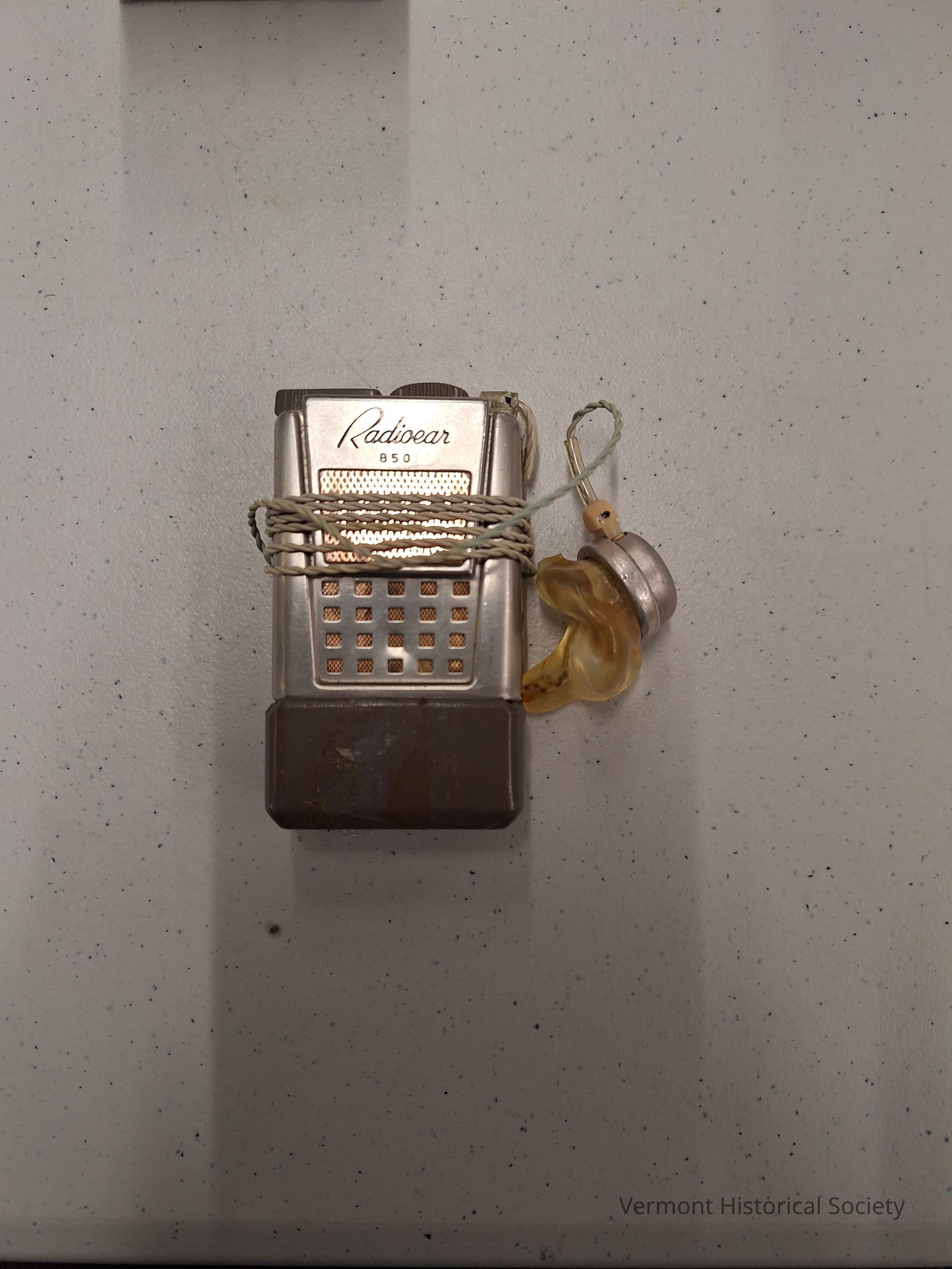 Portable clip-on hearing aid. The mechanism is a small silver metal box that clips to the wearer's waist and is inscribed "Radioear" across the top edge. There is a dial and switch at the top to adjust volume and frequency. The audio cable plugs into the top corner and has a molded earpiece at the other end.