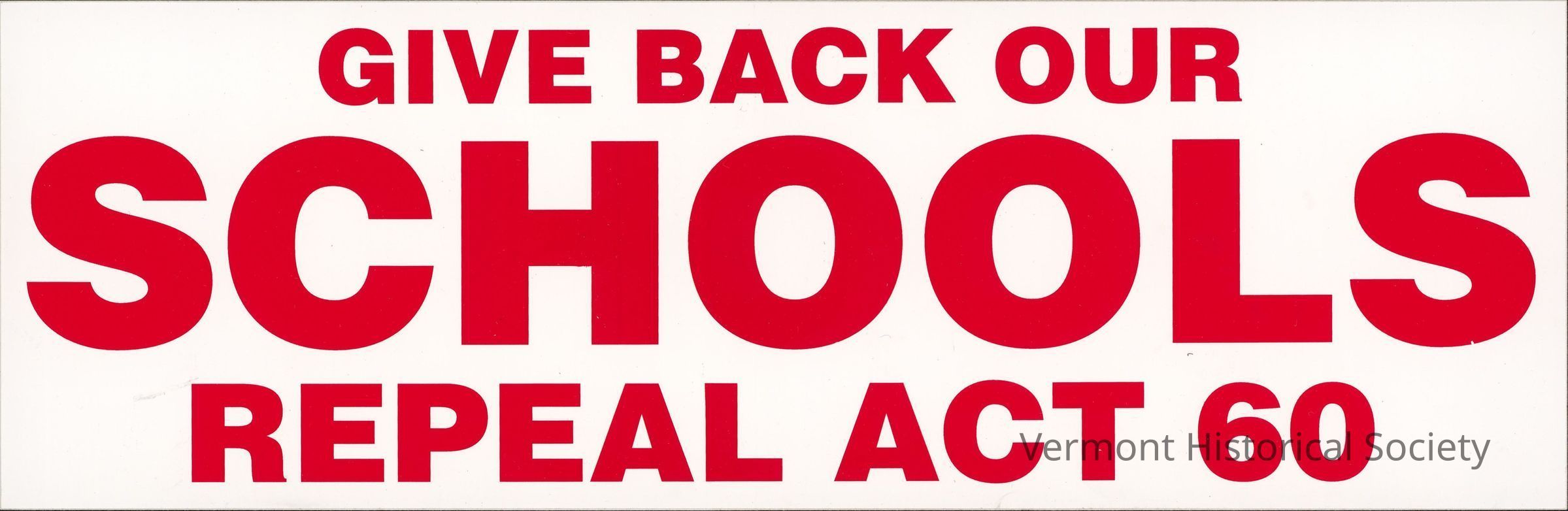 Bumper sticker with the wording "GIVE BACK OUR SCHOOLS REPEAL ACT 60" in red text on white background