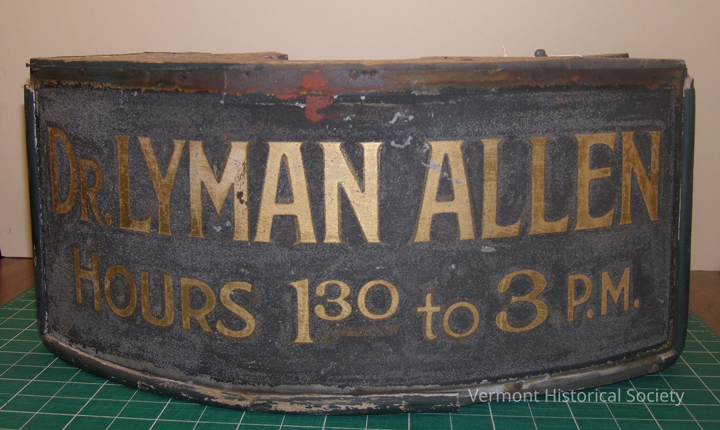 Used on the office of Dr. Lyman Allen on Main Street in Burlington, VermontAcquisition