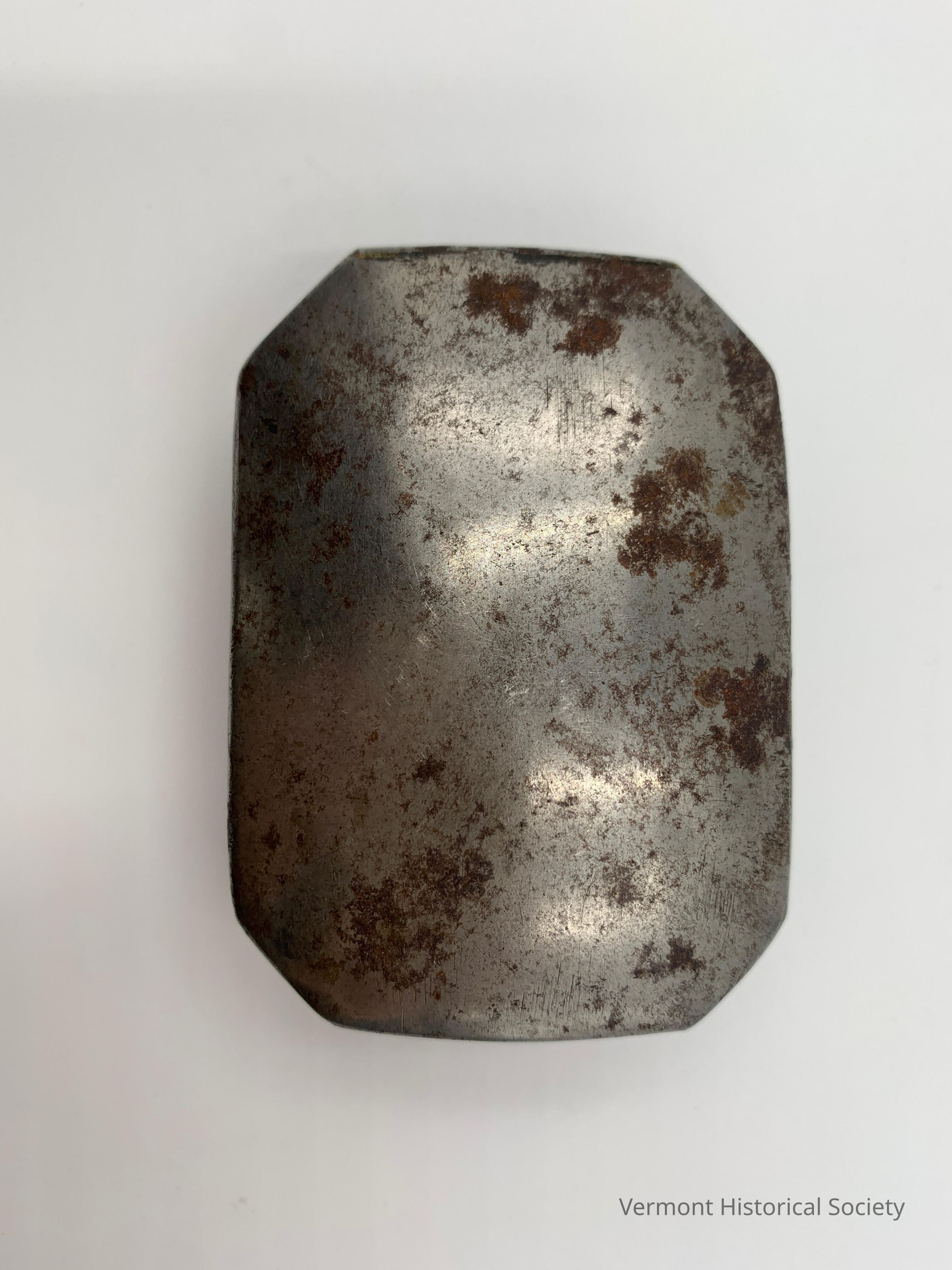Silver-toned metal snuffbox. The box is rectangular with chamfered corners.