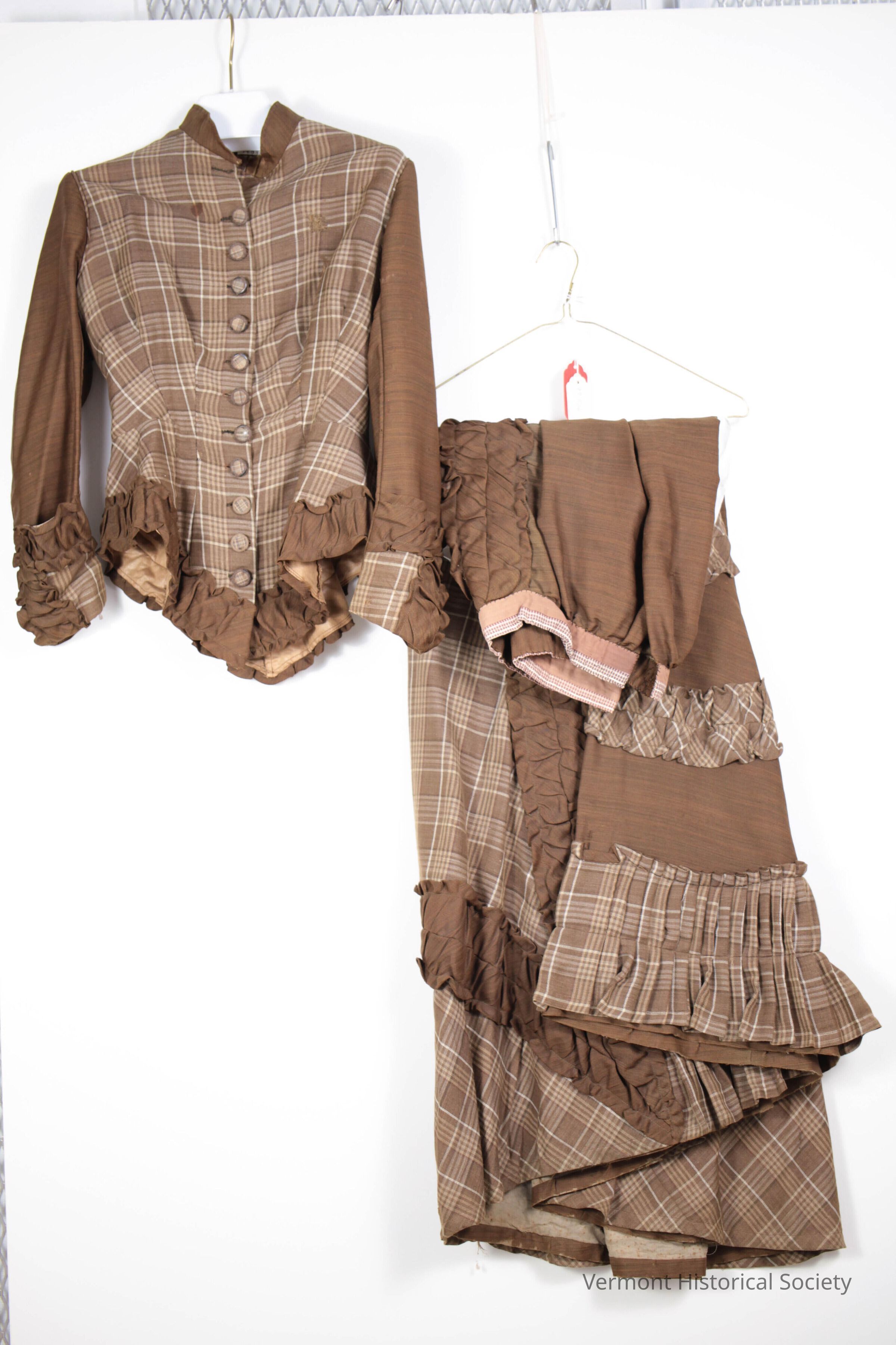 Two-piece brown wool dress consisting of a bodice and skirt. The bodice is made from a brown plaid on the body and plain brown striated wool on the sleeves. It opens up the center front with 12 self-fabric covered buttons and fits to the wearer's body with four tucks. The cuffs and hem are decorated with gathered brown wool, and the hemline is pointed at both the front and back. The skirt is made as one piece, attached to a wide waistband (modern), but styled to look like a petticoat and overskirt. The overskirt portion covers the sides and back and is made of plain brown wool, while the petticoat portion shows at the front and around the hem and is made of brown plaid wool. The skirt is decorated with ruched self fabric around the edges of the various pieces and in an arch across the front hem. The back is decorated with pleated, horizontal strips of the plaid fabric.Context