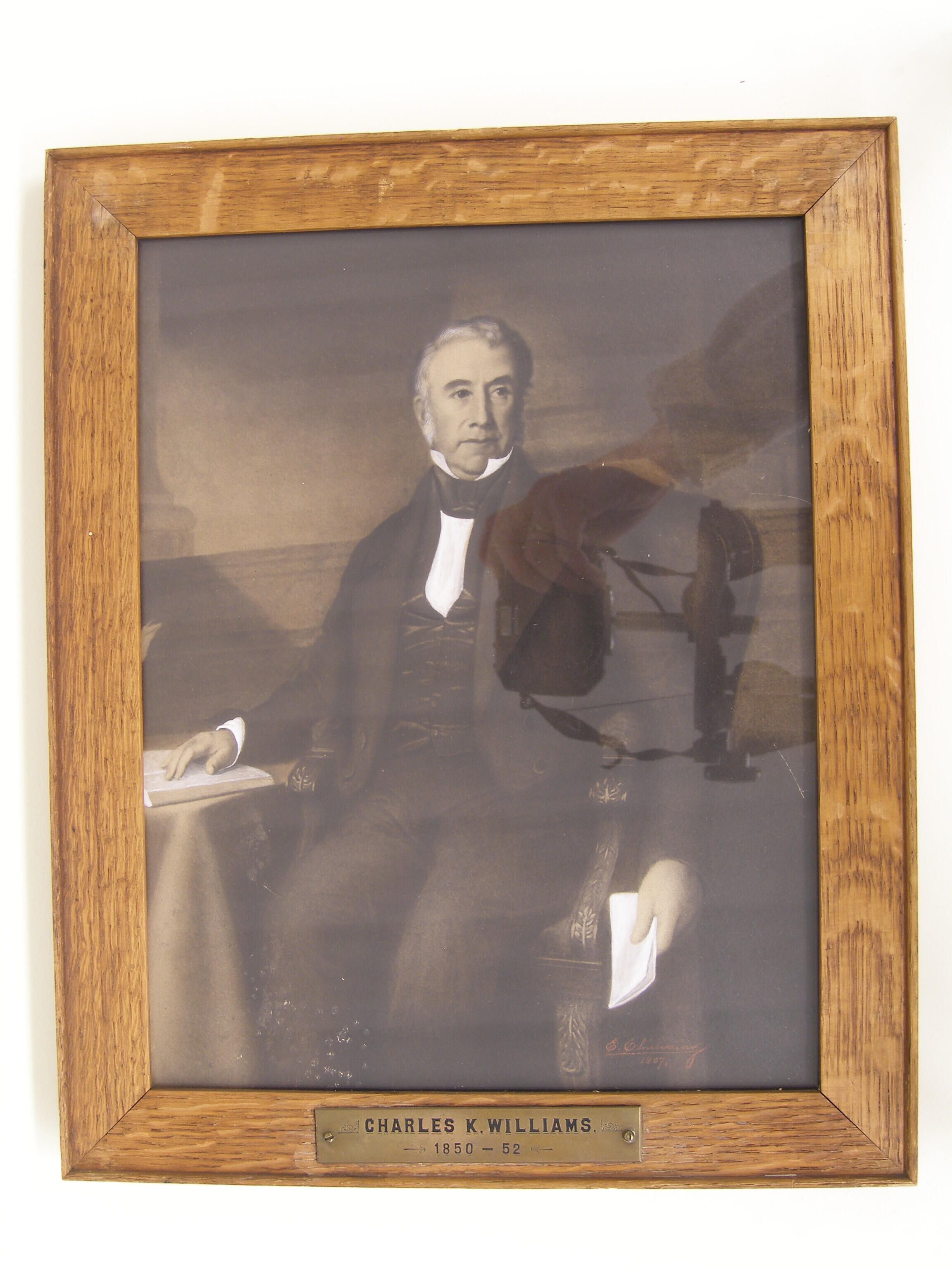 Print showing a man seated in an elaborately carved chair beside a table. The man has white hair and sideburns, and is wearing black pants, jacket, vest, and bowtie, and a white shirt. He is holding a folded piece of paper in his left hand and is resting his right hand on a book on the table. The print is in a wooden frame with a small metal plaque at the center bottom that reads, "CHARLES K. WILLIAMS. 1850 - 52".Artwork Details