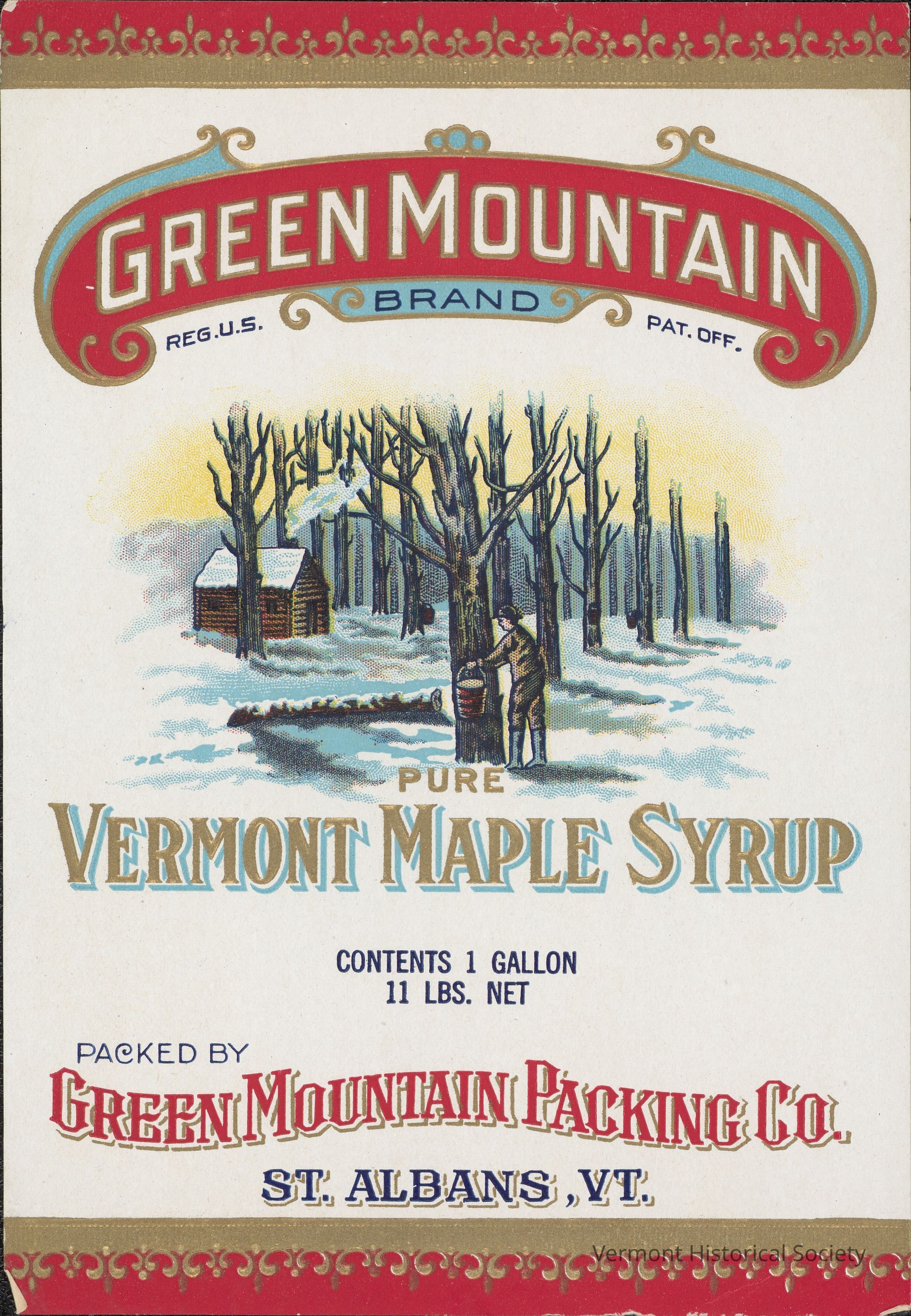 Rectangular can or bottle label. The label is a pale white paper with a red and gold fleur de lis style border at the top and bottom edges. The center of the label has a colored image of figures collecting maple sap in a grove and a log cabin with smoke rising out of the chimney at the left. The label reads, "GREEN MOUNTAIN / BRAND / REG. U.S. / PAT. OFF." in and around a red scroll banner at the top. Below the image are the words, "PURE VERMONT MAPLE SYRUP / CONTENTS 1 GALLON / 11 LBS. NET / PACKED BY / GREEN MOUNTAIN PACKING CO. / ST. ALBANS, VT." in gold, blue, and red script and block printing.Acquisition