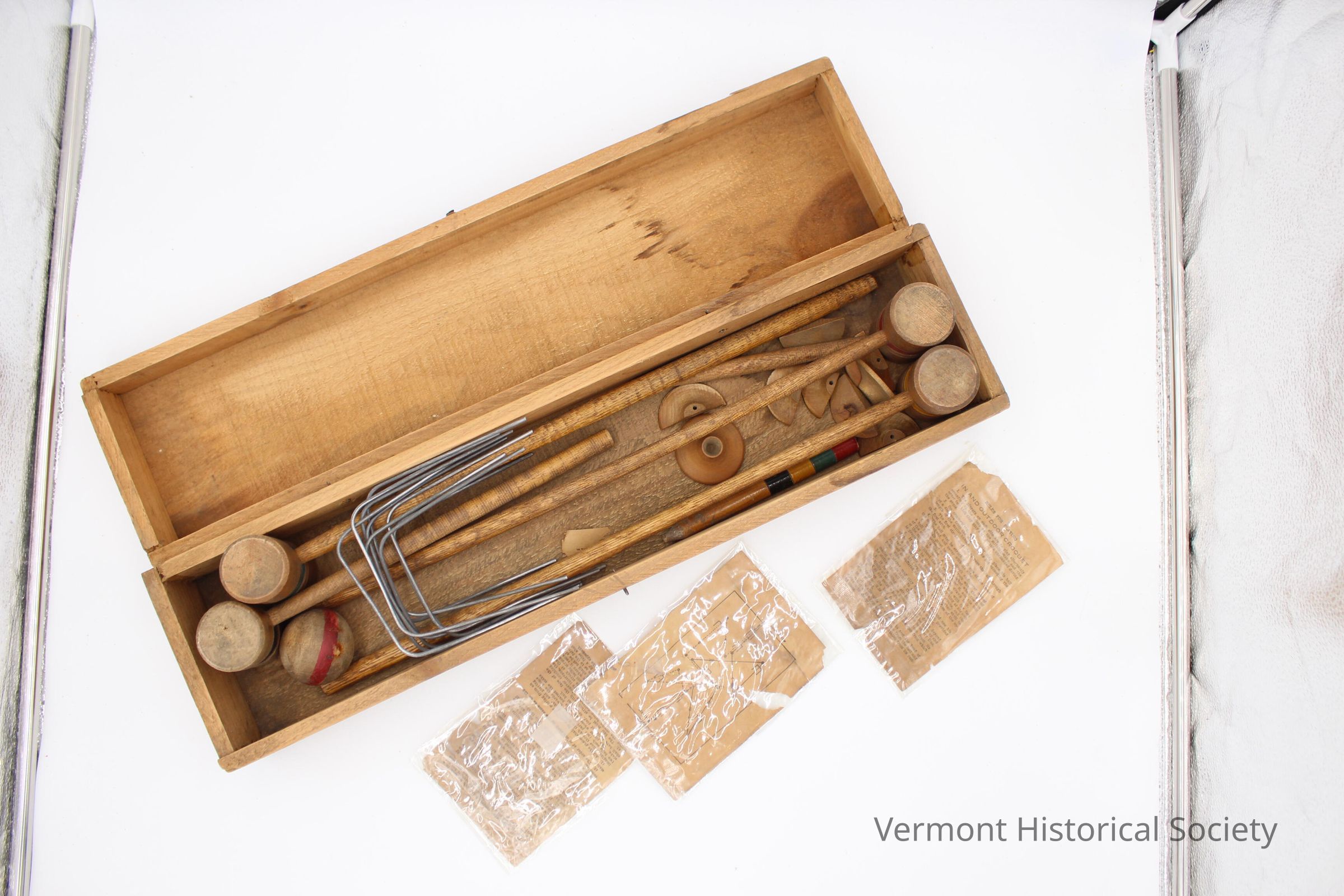 Croquet set consisting of 4 mallets, 9 hoops, 8 hoop stands (enough for 4 hoops), one peg, one peg stand, one ball, paper instructions, and wooden box.Context