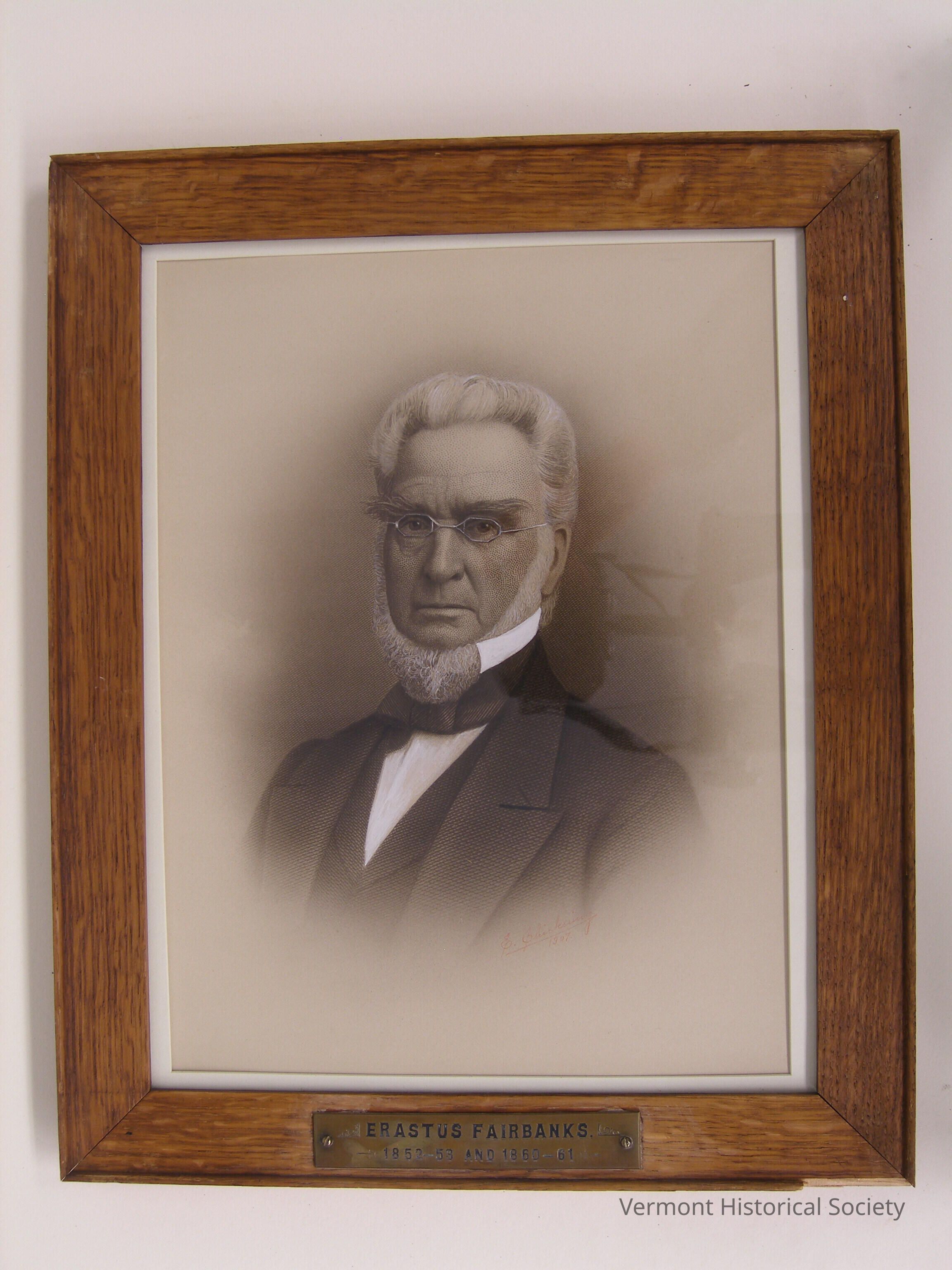 Print showing a man wearing a black suit jacket, vest, and bowtie, and a white shirt. His white hair is brushed tall, and he has a white beard running under his jawline. He is wearing small, wireframed glasses. The print is framed in a wooden frame beneath white matboard. A metal plaque at the bottom center of the frame reads, "ERASTUS FAIRBANKS 1852 - 53 AND 1860 - 61".Artwork Details