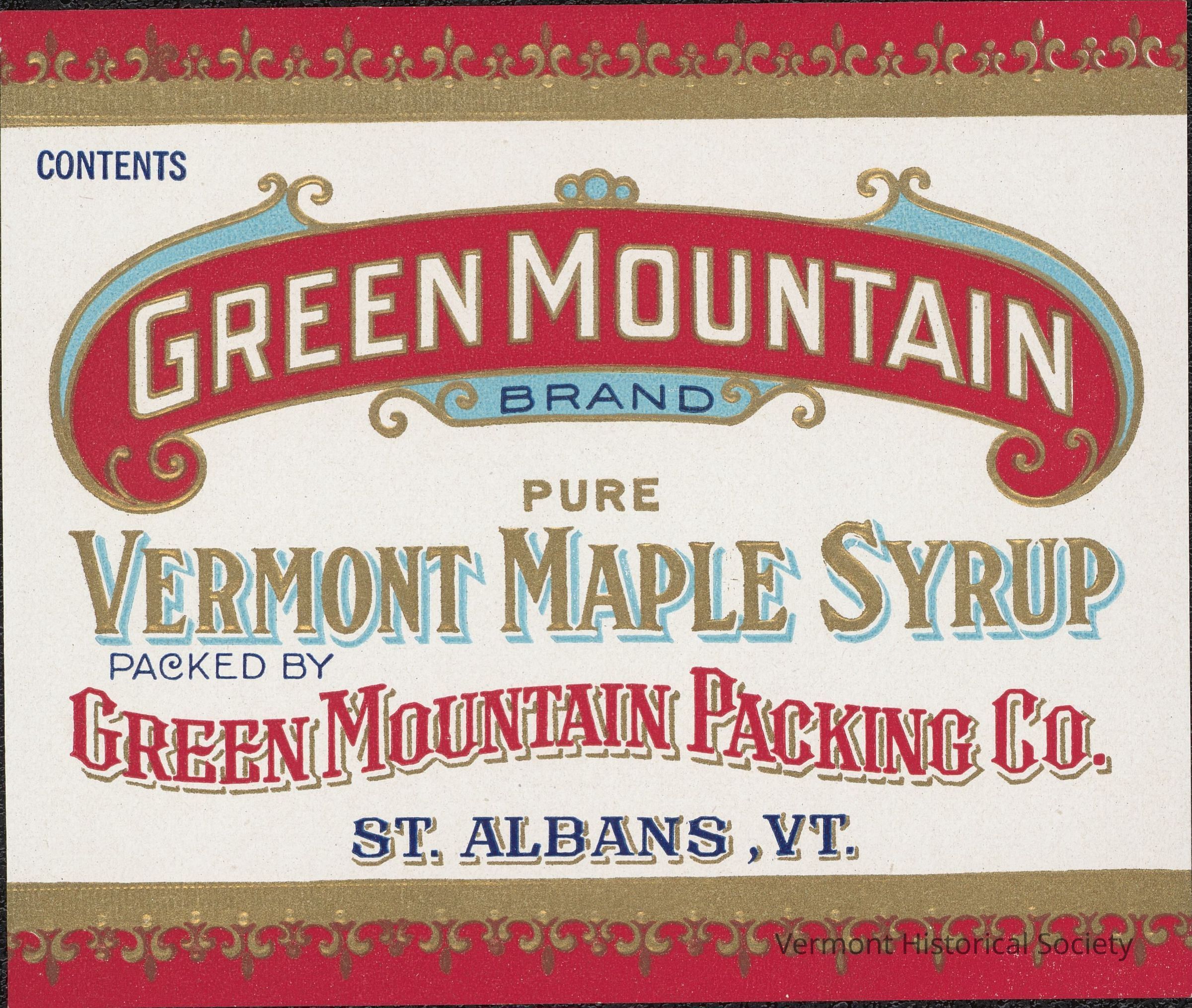 Rectangular can or bottle label. The label is a pale white paper with a red band and gold fleur-de-lis border at the top and bottom edges. The label reads, "CONTENTS / GREEN MOUNTAIN / BRAND" in and around a red scroll banner at the top. The banner is ornamented by gold swirled edges and blue detailing. Below the banner are the words, "PURE / VERMONT MAPLE SYRUP / PACKED BY / GREEN MOUNTAIN PACKING CO. / ST. ALBANS, VT." printed in various colored scripts. "Pure Vermont Maple Syrup" is in gold, "packed by" and "St. Albans, VT." are in blue, and "Green Mountain Packing Co" is in red.Acquisition