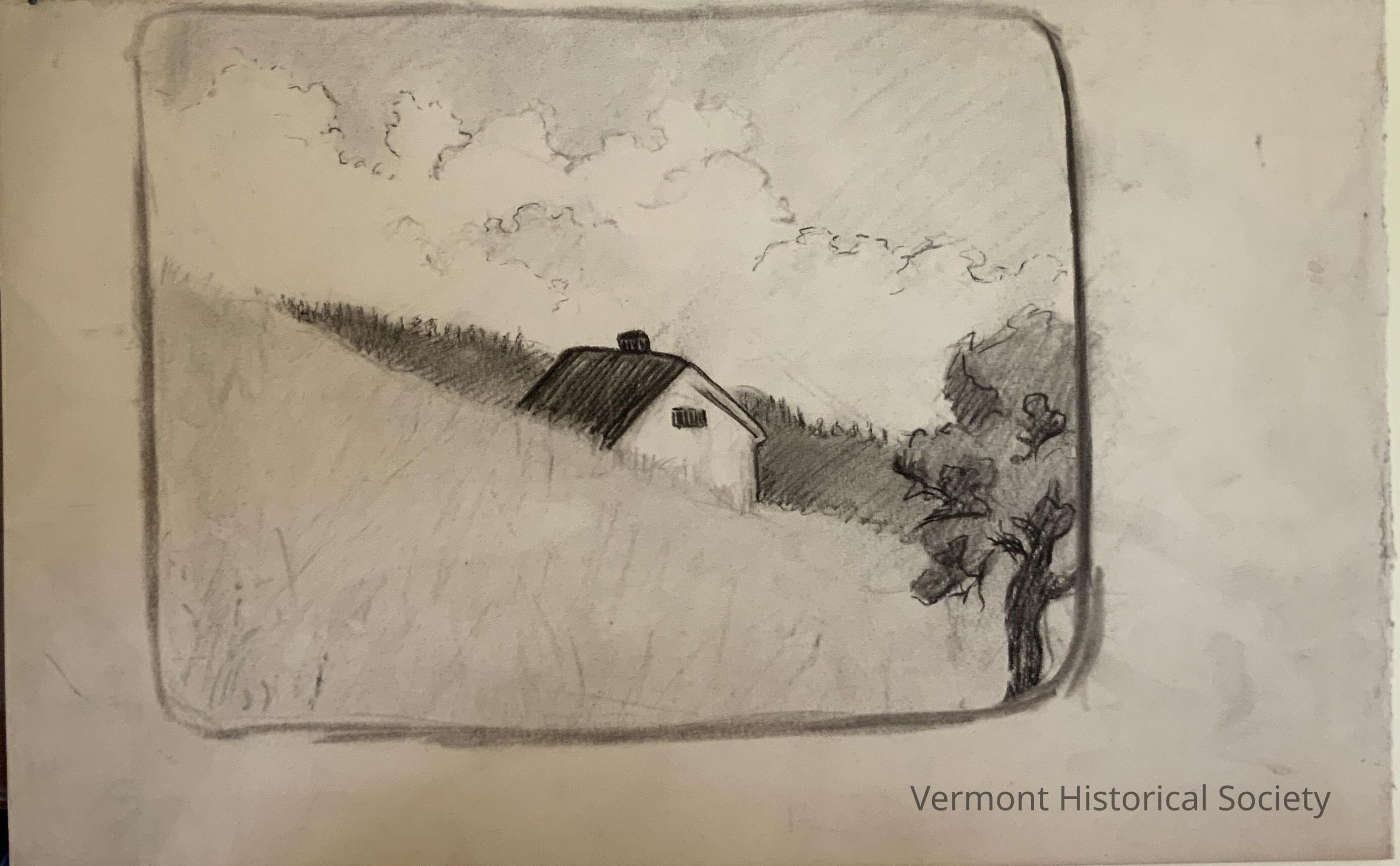 A charcoal drawing of a house on a hill. Not very detailed and unsigned and undated.Type of Drawing