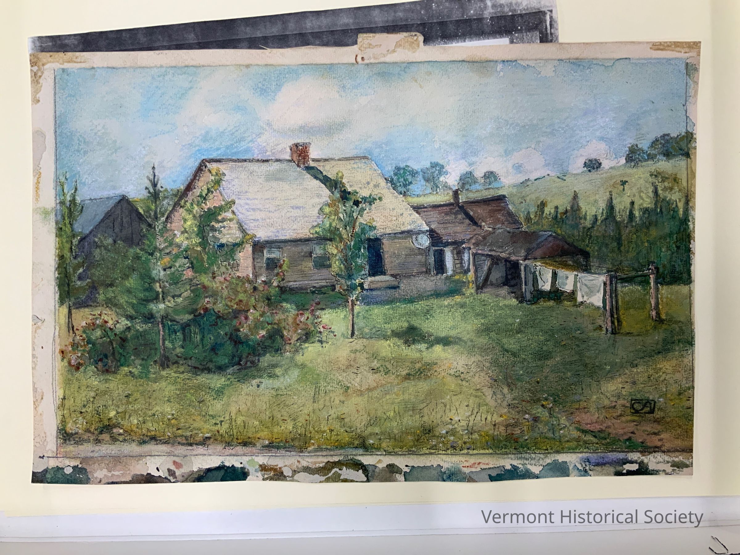 Watercolor painting showing a house or cabin in the countryside. The structure has an open doorway and 2 windows on the front. There is a single step leading to the doorway, and a chimney at the center of the roofline. There is a small, one-story attachment on the right of the structure, with a chimney. A stable is attached perpendicularly to the front of the attachment. A clothesline with three white sheets stretches from the stable to the right of the scene. There is a small copse of trees to the left of the structure, and a barn is visible behind it. There are rolling hills in the background, and the sky is blue with white clouds.Type of Painting