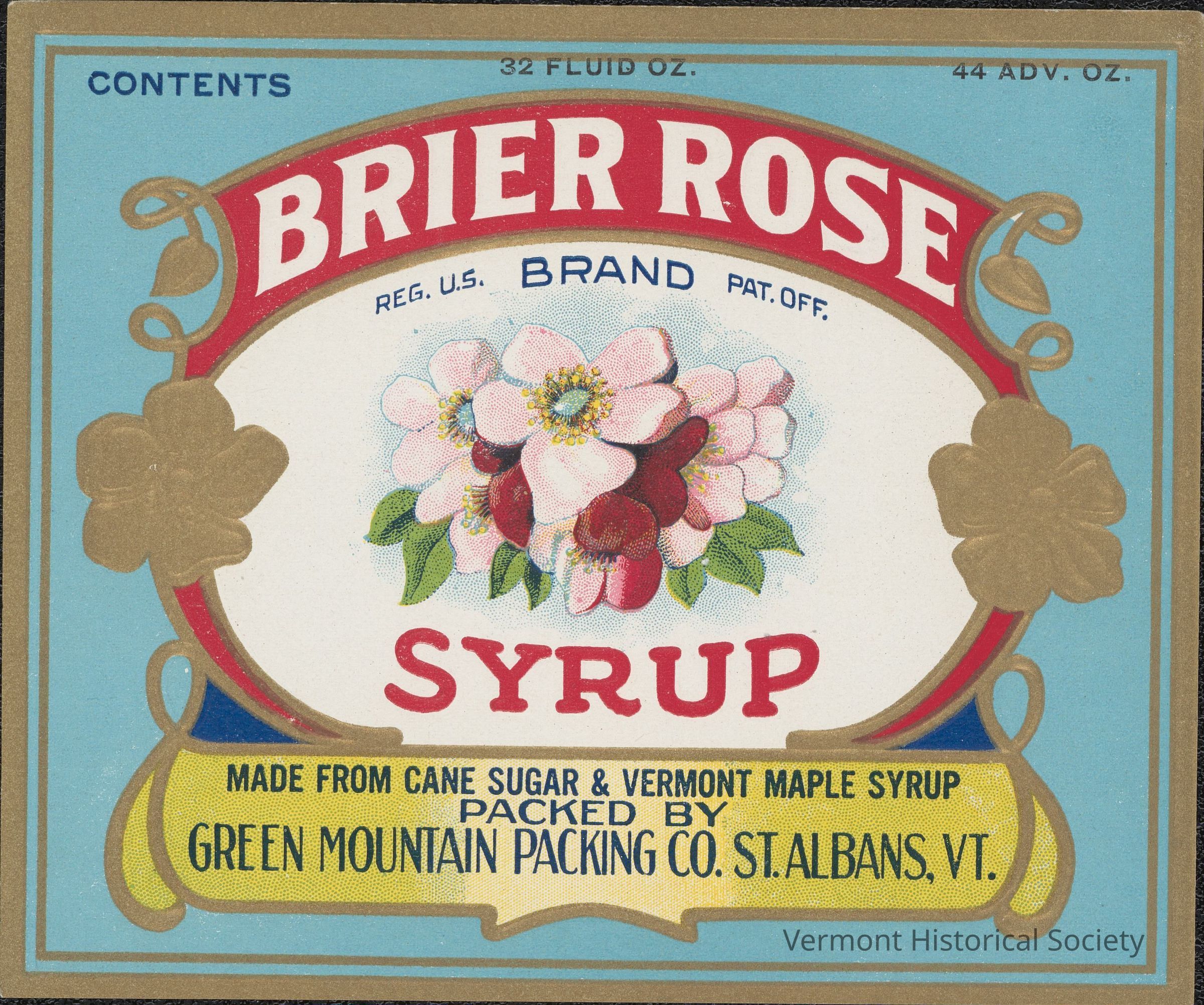 Rectangular syrup labels for can or bottle, count of 12. The label has a pale blue background with a two-lined gold border. The top of the label reads "CONTENTS 32 FLUID OZ. 44 ADV. OZ" in navy and black printed text. In the center is a label enclosed by a design of gold flower and vines, interior of which is a white oval with an image of blooming flowers and leaves. Above the illustration on a red background are the words "BRIER ROSE" in white text. Surrounding the the image are the words "REG. U.S. BRAND PAT.OFF. / SYRUP" in navy and red text. Below the image are the words "MADE FROM CANE SUGAR & VERMONT MAPLE SYRUP / PACKED BY / GREEN MOUNTAIN PACKING CO. ST.ALBANS, VT." in navy text on a yellow scroll banner.Acquisition