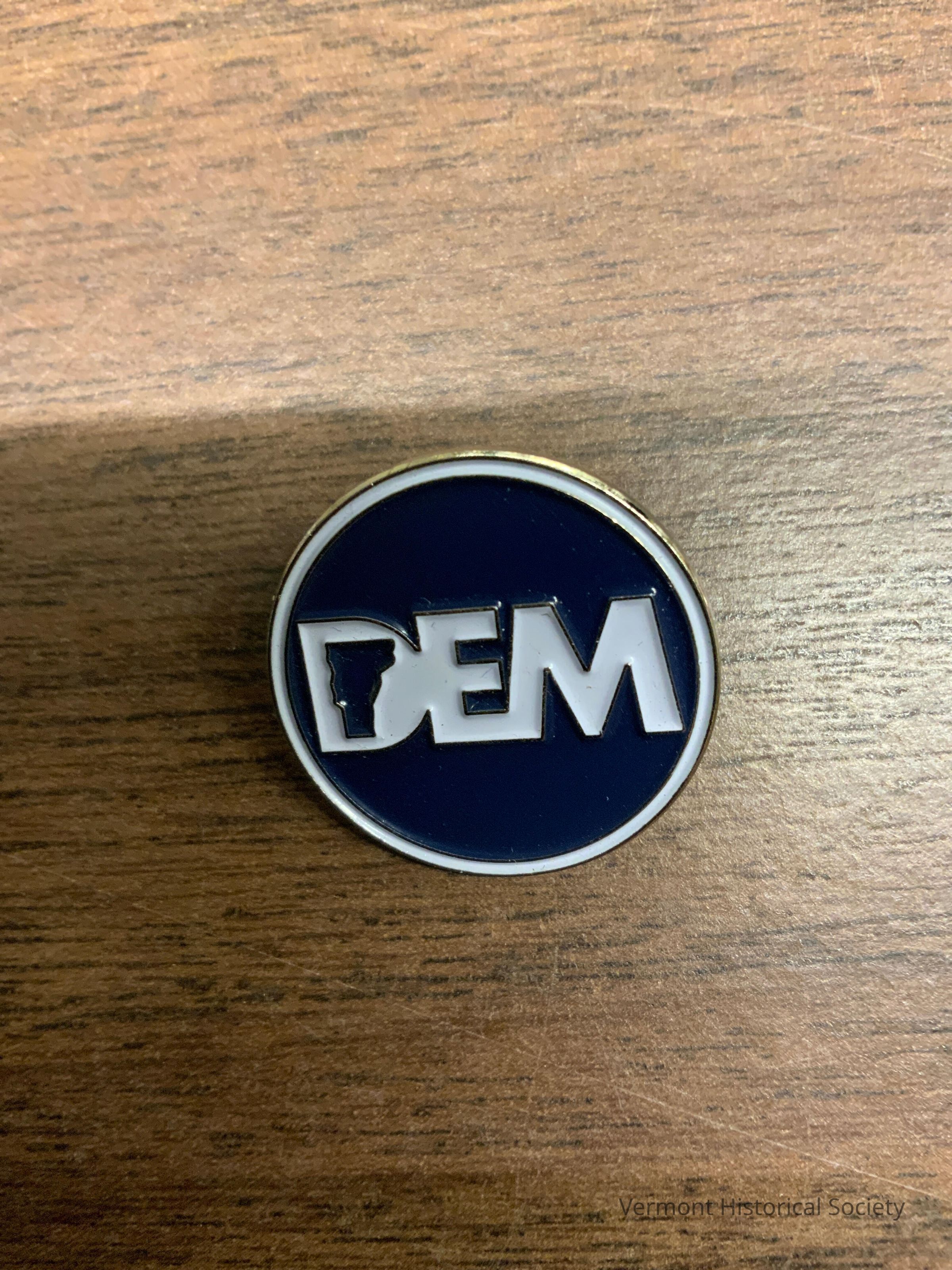 Round enameled pin with the inscription "DEM". The ground of the pin is blue, and the letters and a narrow border are white. The hole in the D is in the shape of the state of Vermont.