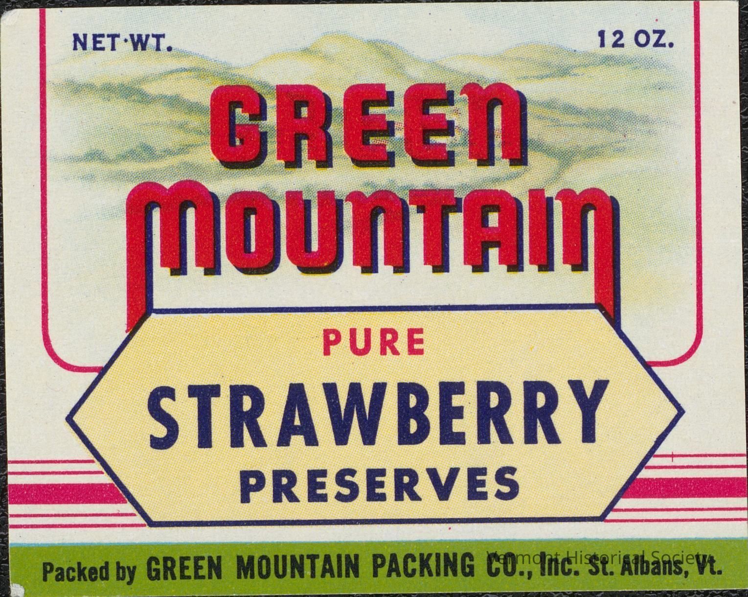 Rectangular jar label. The label is a plain white paper ground with red striped border looping from the top edge around a central image and a set of red stripes below it. The label shows a printed image of mountains and reads, "GREEN / MOUNTAIN" in red and "PURE / STRAWBERRY / PRESERVES" in red and blue on an angled pale yellow cartouche. Below the image reads, "Packed by GREEN MOUNTAIN PACKING CO., Inc. St. Albans, Vt." in dark blue or black print on a green band.