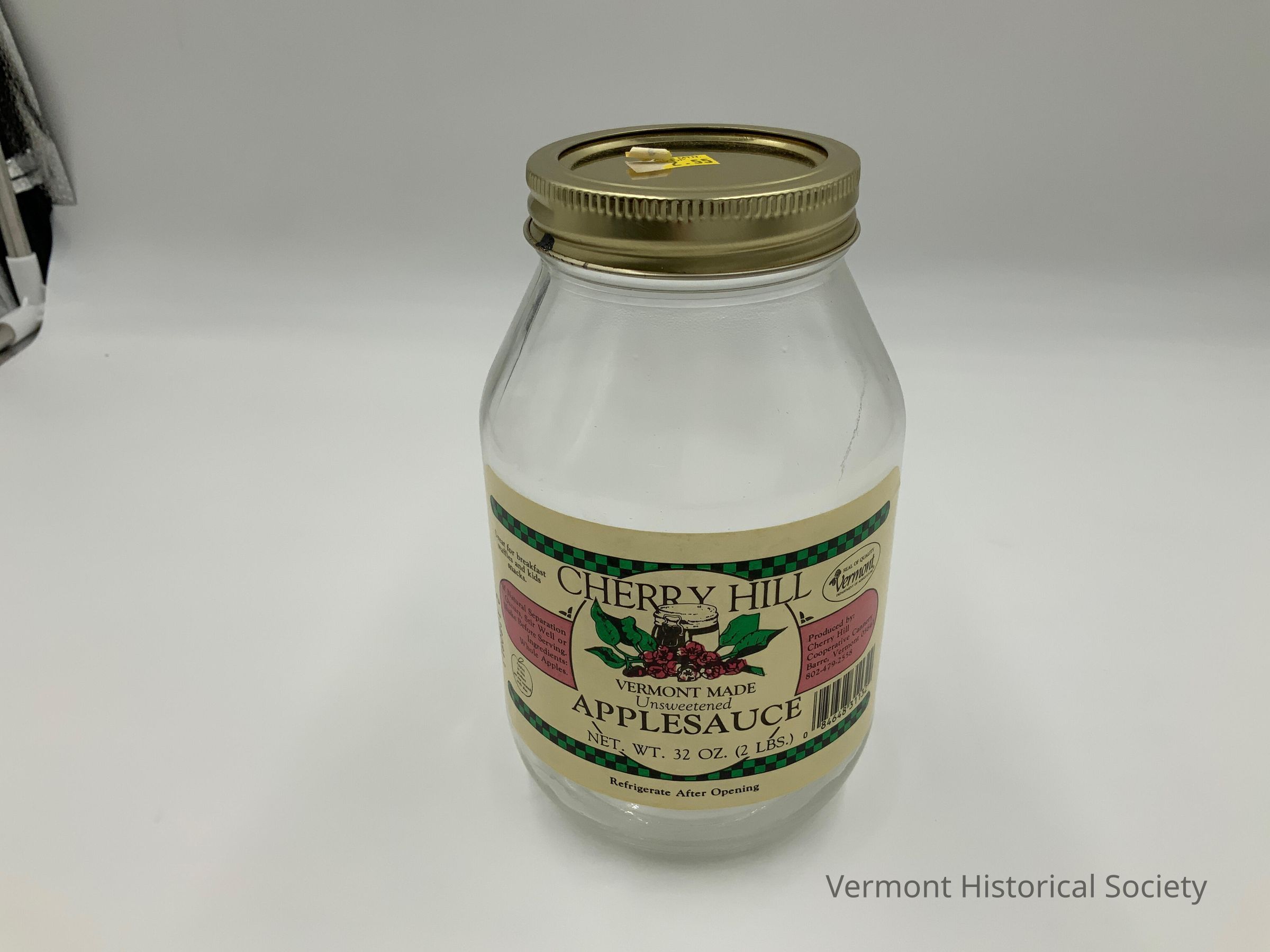A large jar with canning-type screw top that held Cherry Hill brand applesauce. The label for this 32-ounce jar says it is "Vermont made, unsweetened." The jar has a Vermont Department of Agriculture seal of quality. It was produced by Cherry Hill Cooperative Cannery, Barre, Vermont. A peeling paper sticker on top said it was purchased for $2.55 at Hunger Mountain Coop, which is located in Montpelier.Acquisition