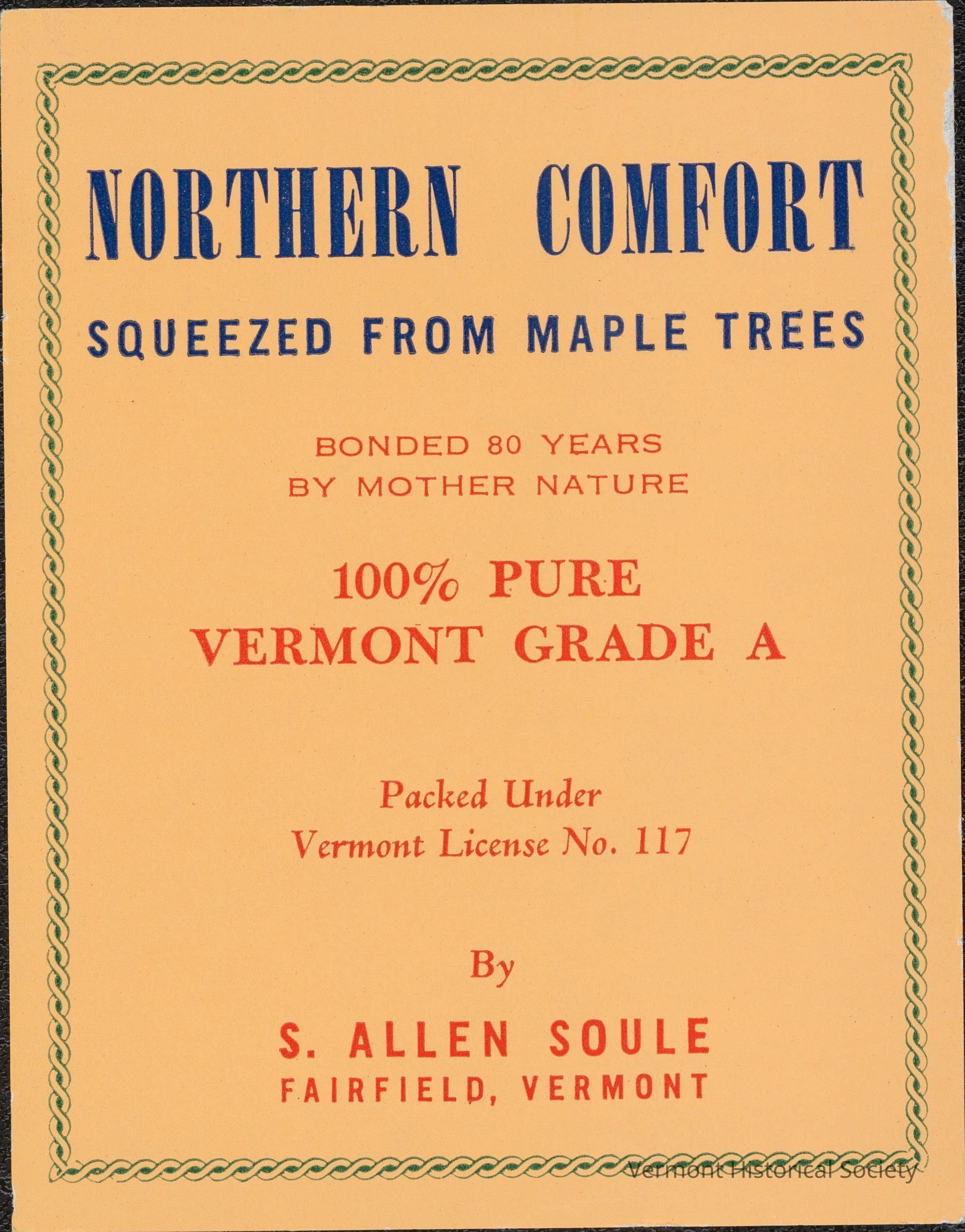 Rectangular can/bottle label. The label is a creamy yellow ground with a green printed rope twist border just inside the outer edges. The label reads, "NORTHERN COMFORT / SQUEEZED FROM MAPLE TREES" in navy block printing and "BONDED 80 YEARS / BY MOTHER NATURE / 100% PURE / VERMONT GRADE A / Packed Under / Vermont License No. 117 / By / S. ALLEN SOULE / FAIRFIELD, VERMONT" in orange/red smaller print.