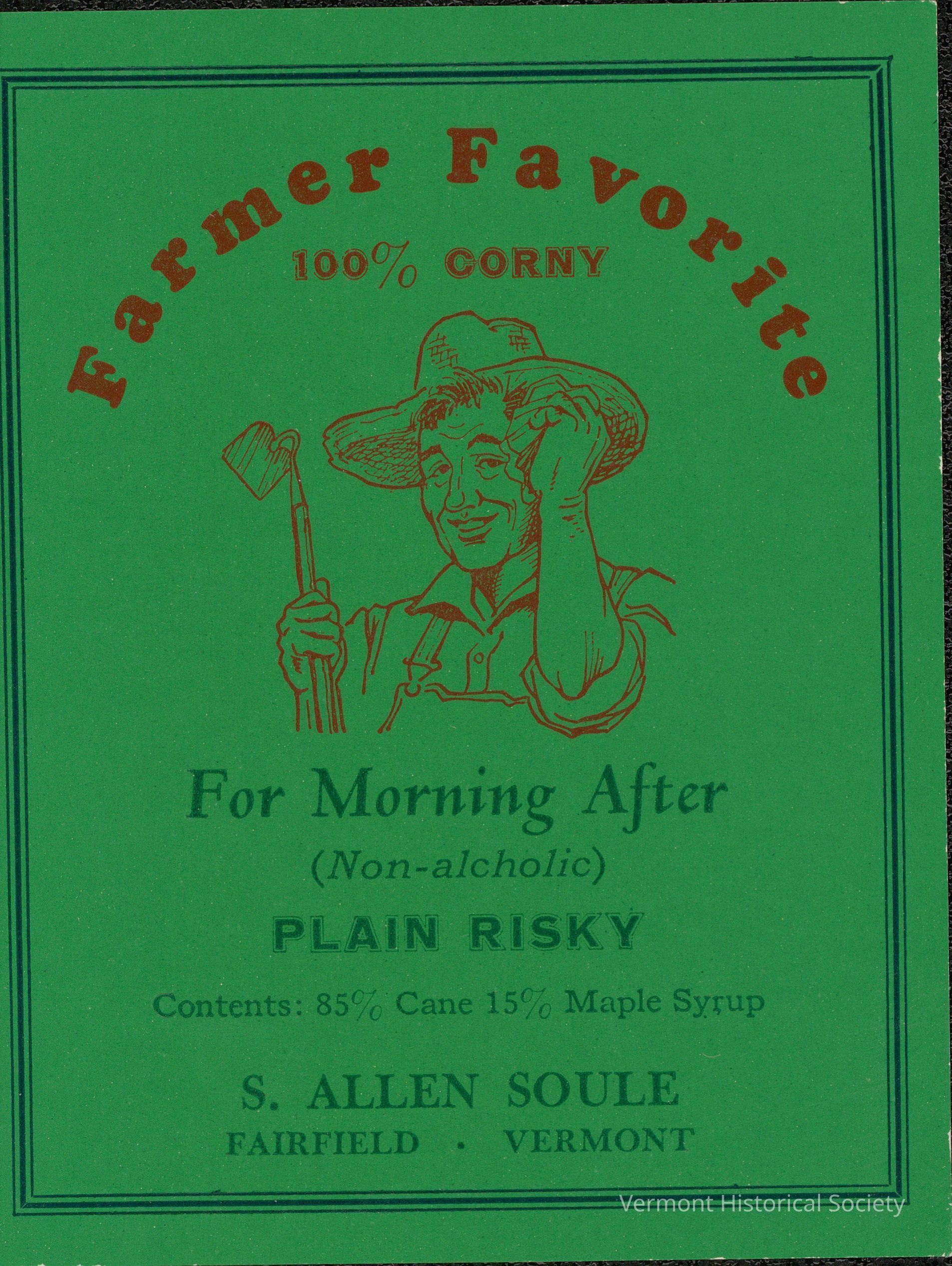 Rectangular bottle/jar label. The label is a bright green color with a navy line border just inside the edge. The center features an image of a male farmer with sleeves rolled up, wearing a straw hat, holding a hoe, and wiping his brow. Above the figure are the words, "Farmer Favorite / 100% CORNY" in red. Below the image are the words, "For Morning After / (Non-alcholic) / PLAIN RISKY / Contents: 85% Cane 15% Maple Syrup / S. ALLEN SOULE / FAIRFIELD. VERMONT" in dark blue.Acquisition