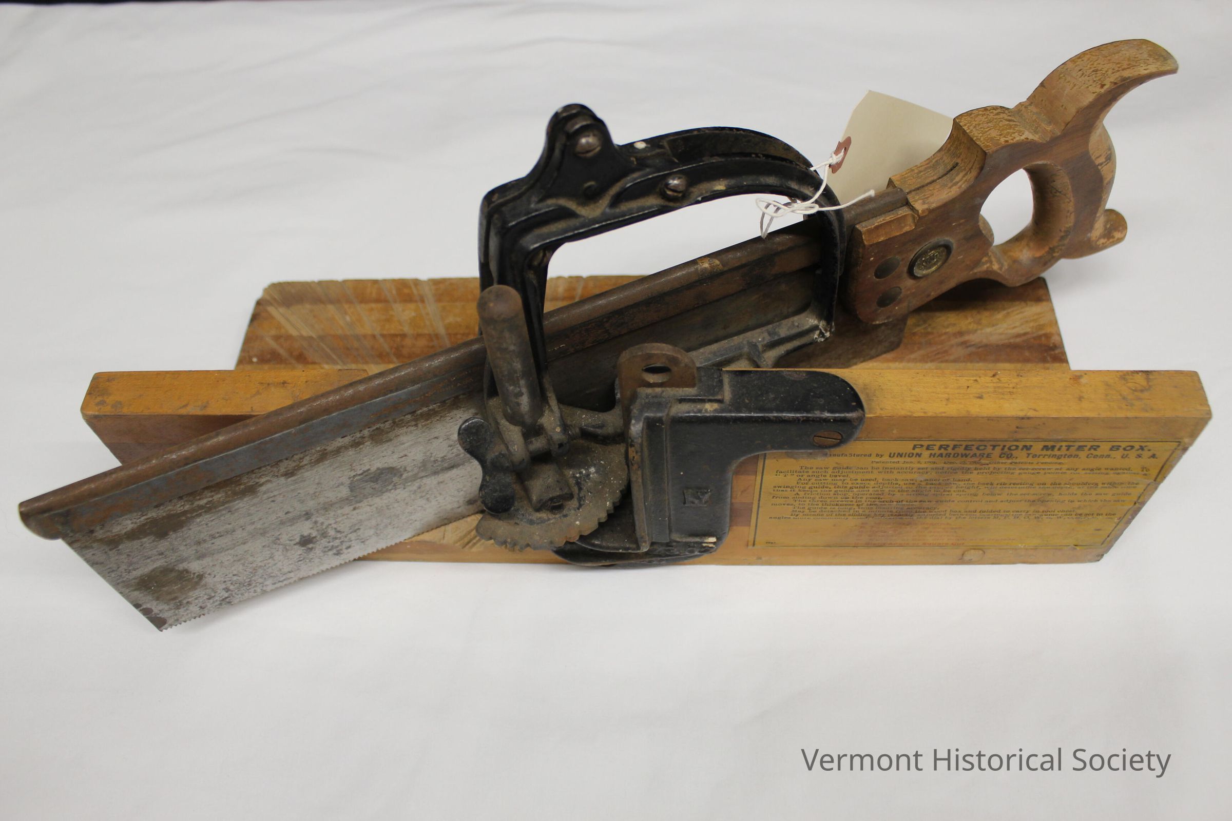 Saw and miter-box consisting of a handsaw inserted through a metal mount attached to two perpendicular wooden boards. There is a paper label on the backside of the miter-box that says it is a Perfection Miter Box, manufactured by Union Hardware Co. of Torrington, Conn. USA. It lists two patent dates: Jan. 8, 1901 and Dec. 23, 1902. Underneath this information are directions for use of this tool. The word "Perfection" is also found on the metal device that holds the saw in place. On the top of the saw blade are the words, "Cast steel, Henry Disston and Sons, Philadelphia and Warranted." A large screw head on the wooden handle has the company name - H. Disston & Sons and an abbreviation for Philadelphia - "Philada."Context