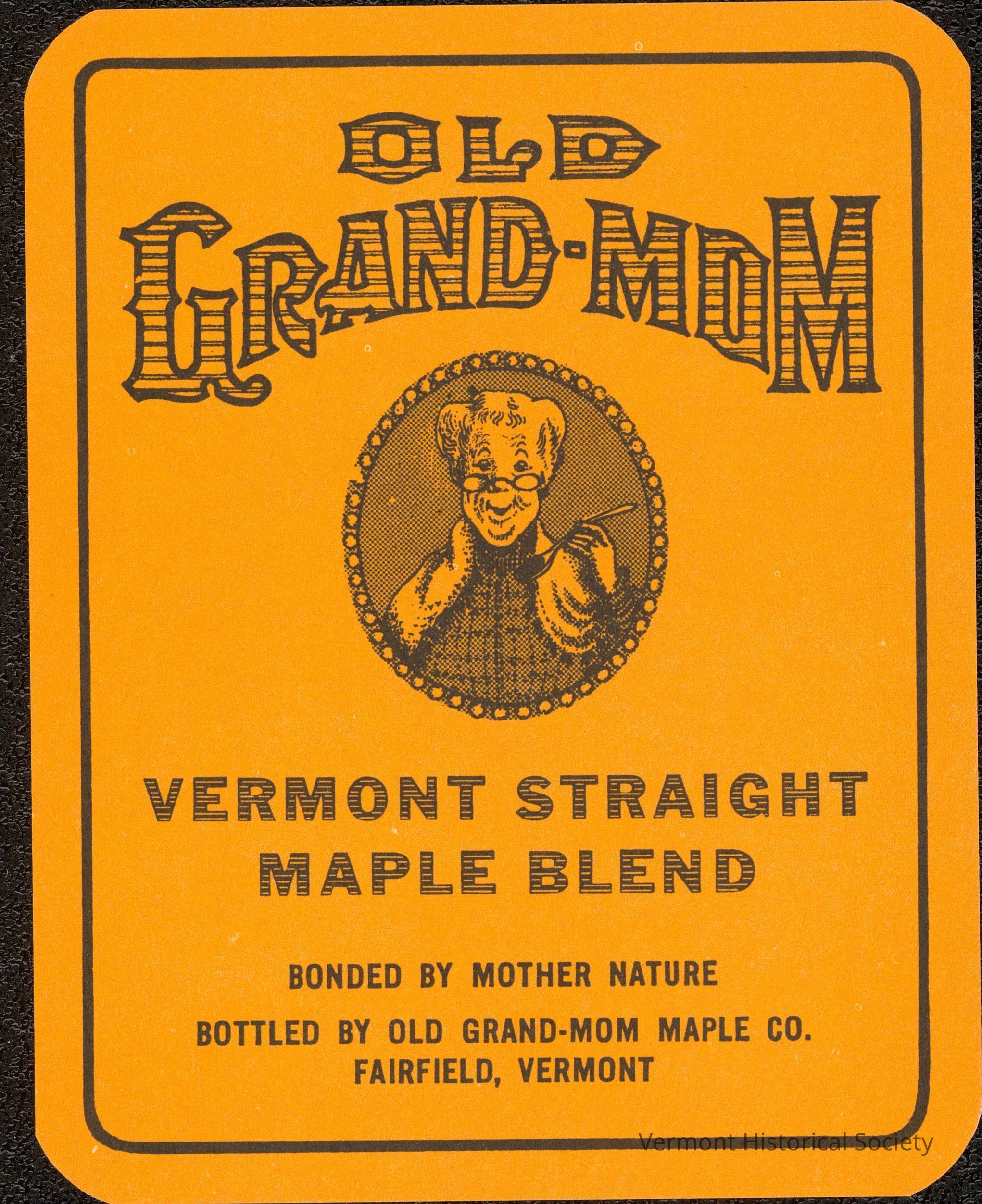 Rectangular bottle label. The label is orange with rounded corners and a simple black line border just inside the edges. There is an oval portrait at the center of an older woman with hair pinned up, wearing glasses and a shawl, and smiling at the viewer with a spoon lifted partway to her lips. The label reads, "OLD / GRAND-MOM" above the image and "VERMONT STRAIGHT / MAPLE BLEND / BONDED BY MOTHER NATURE / BOTTLED BY OLD GRAND-MOM MAPLE CO. / FAIRFIELD, VERMONT" below.Acquisition