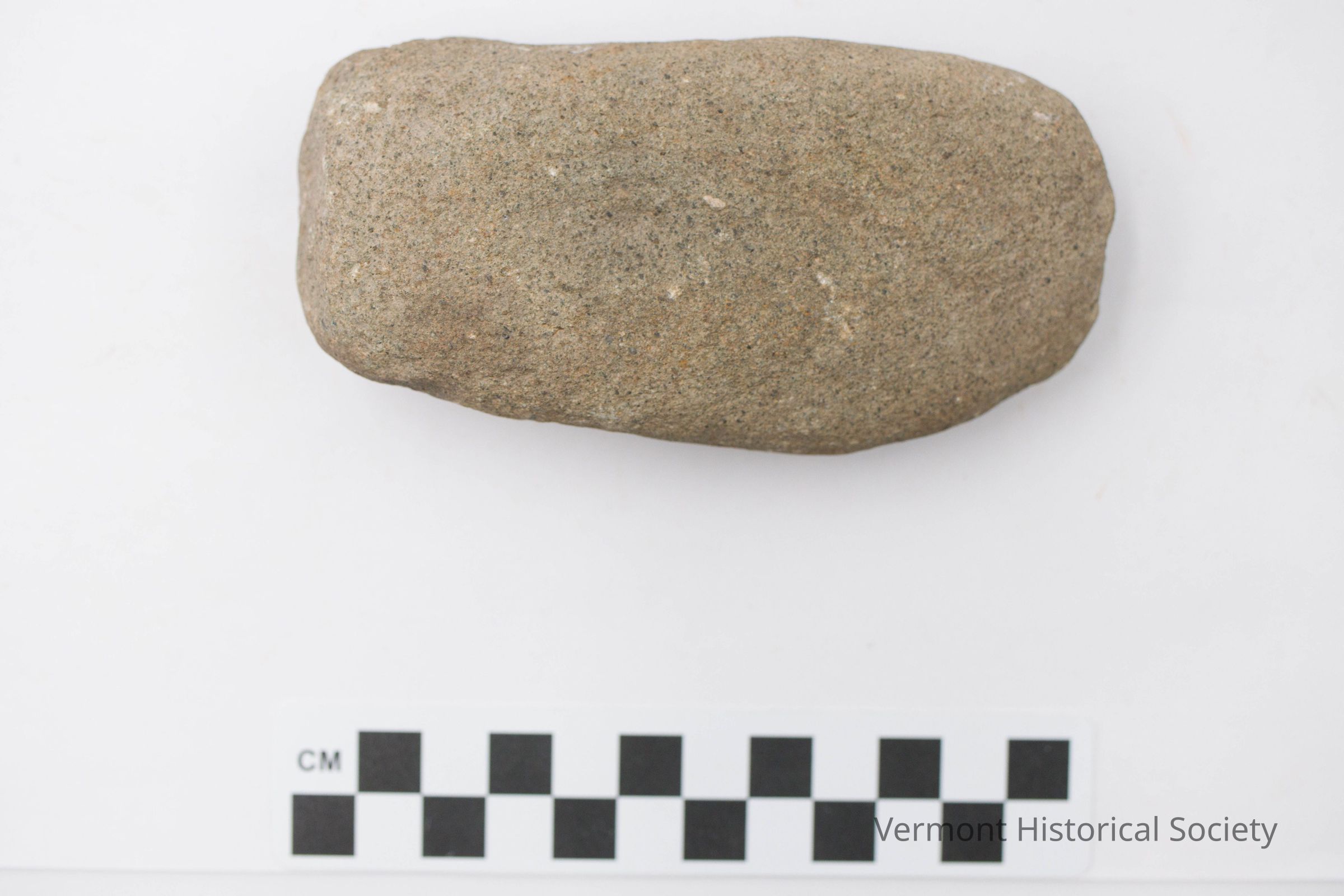 Naturally shaped ground stone pestle. One end is polished by use, and there are small, dished areas on both faces near the middle, possibly from use as a nutting stone.