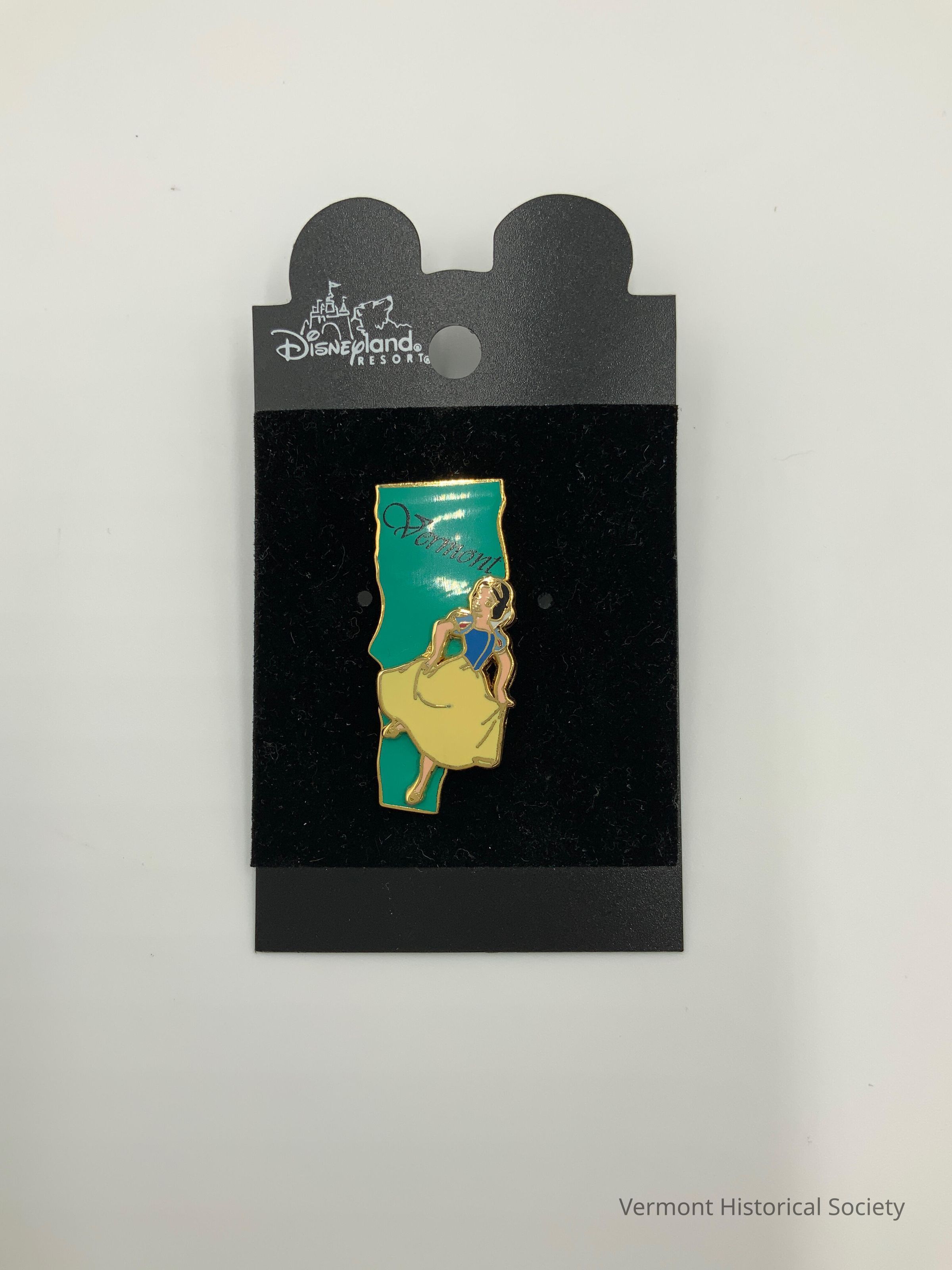 Enameled pin in the shape of the state of Vermont with a woman [Snow White] on it. The woman is wearing a blue bodice and yellow skirt. The word "Vermont" is printed diagonally across the top. The pin is on a plastic backing board printed with the label, "Disneyland RESORT".