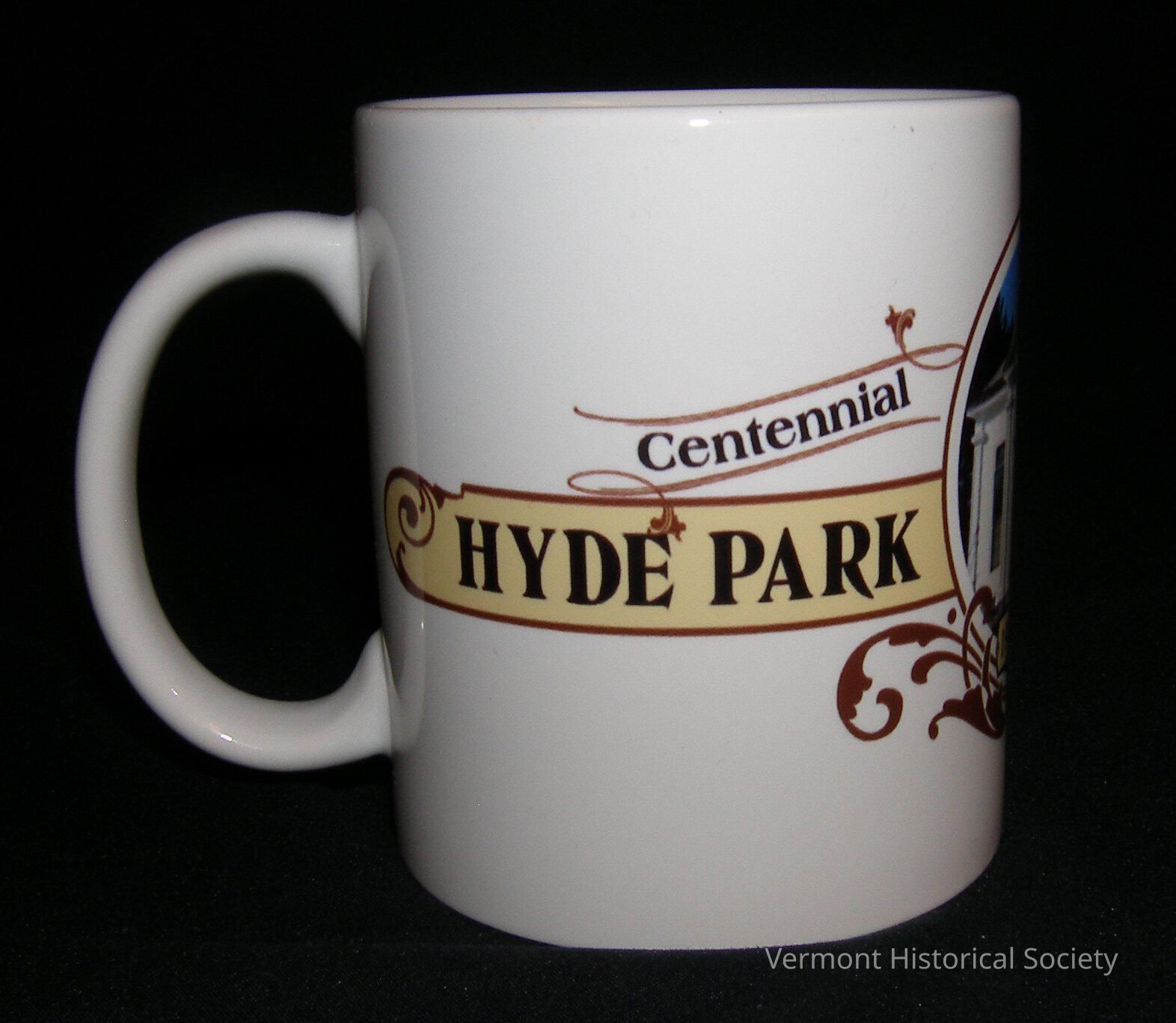 White ceramic coffee mug printed with a photographic image of an arched entryway of a building with the inscription, "Centennial Celebration / HYDE PARK OPERA HOUSE / 1912-2012".