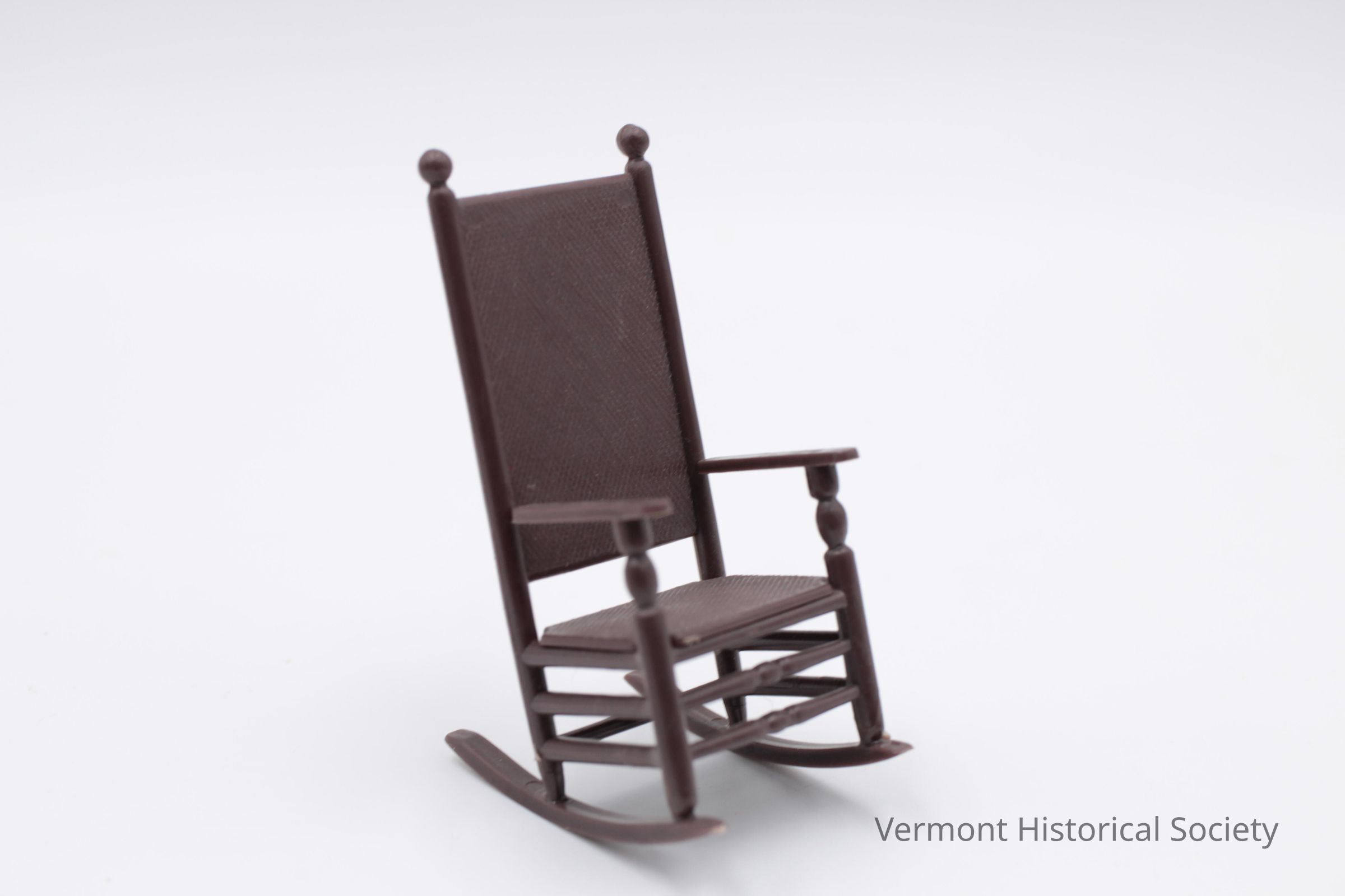 Miniature rocking chair sized for a dollhouse. The chair has a solid seat and back, molded with a hatched pattern to simulate woven rush. The chair has arms on decoratively turned stiles, and two rails between each leg.Context