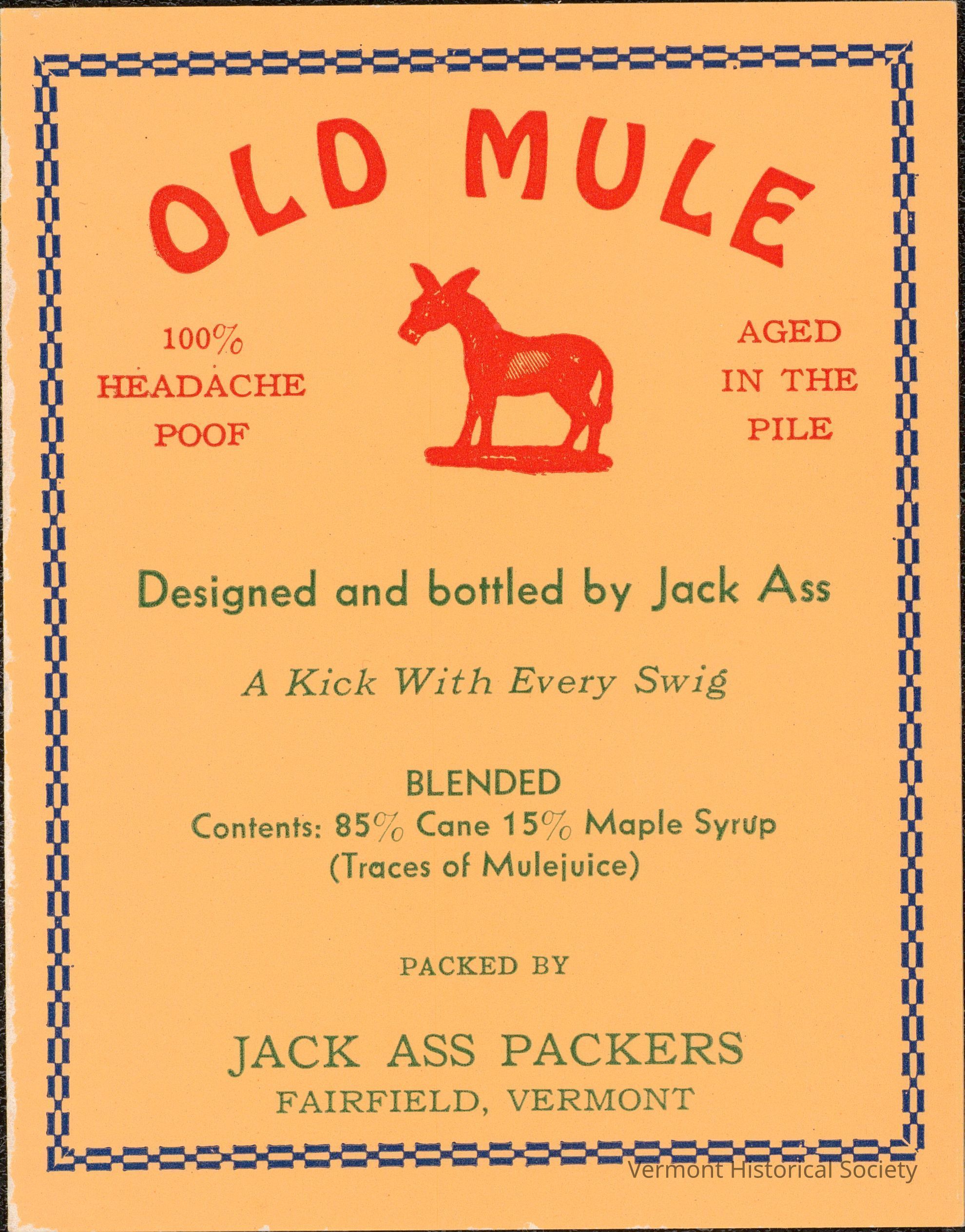 Rectangular bottle label. The label is pale Orange with a blue checked border and the stamped image of a mule in the top third of the label. Around the mule are the words, "OLD MULE / 100% / HEADACHE / POOF / AGED / IN THE / PILE" in red. Below this reads, "Designed and bottled by Jack Ass / A Kick With Every Swig / BLENDED / Contents: 85% Cane 15% Maple Syrup / (Traces of Mulejuice) / PACKED BY / JACK ASS PACKERS / FAIRFIELD, VERMONT" in green.Acquisition