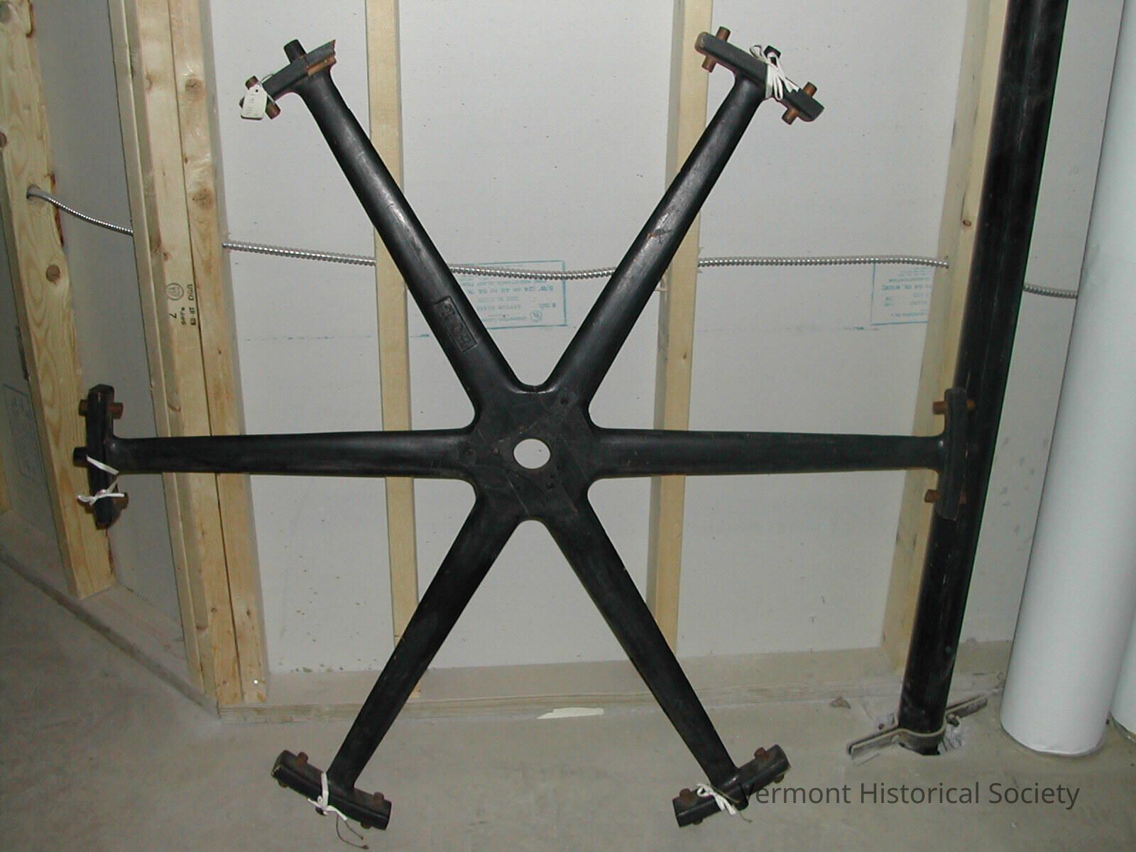 Mold form with six armed spokes looking somewhat like a wagon wheel without the wheel. At the end of each spoke is a 7" piece, perpendicular to the spoke. Each has 5 "pegs." Presumably these pegs fit into another piece we don't have. The 7" piece is "sliced" in two. Three of the spokes are missing half of the piece. One spoke has a half broken end piece. The 3 spokes that have both pieces of the end have been tied together with twine. The twine is "old."