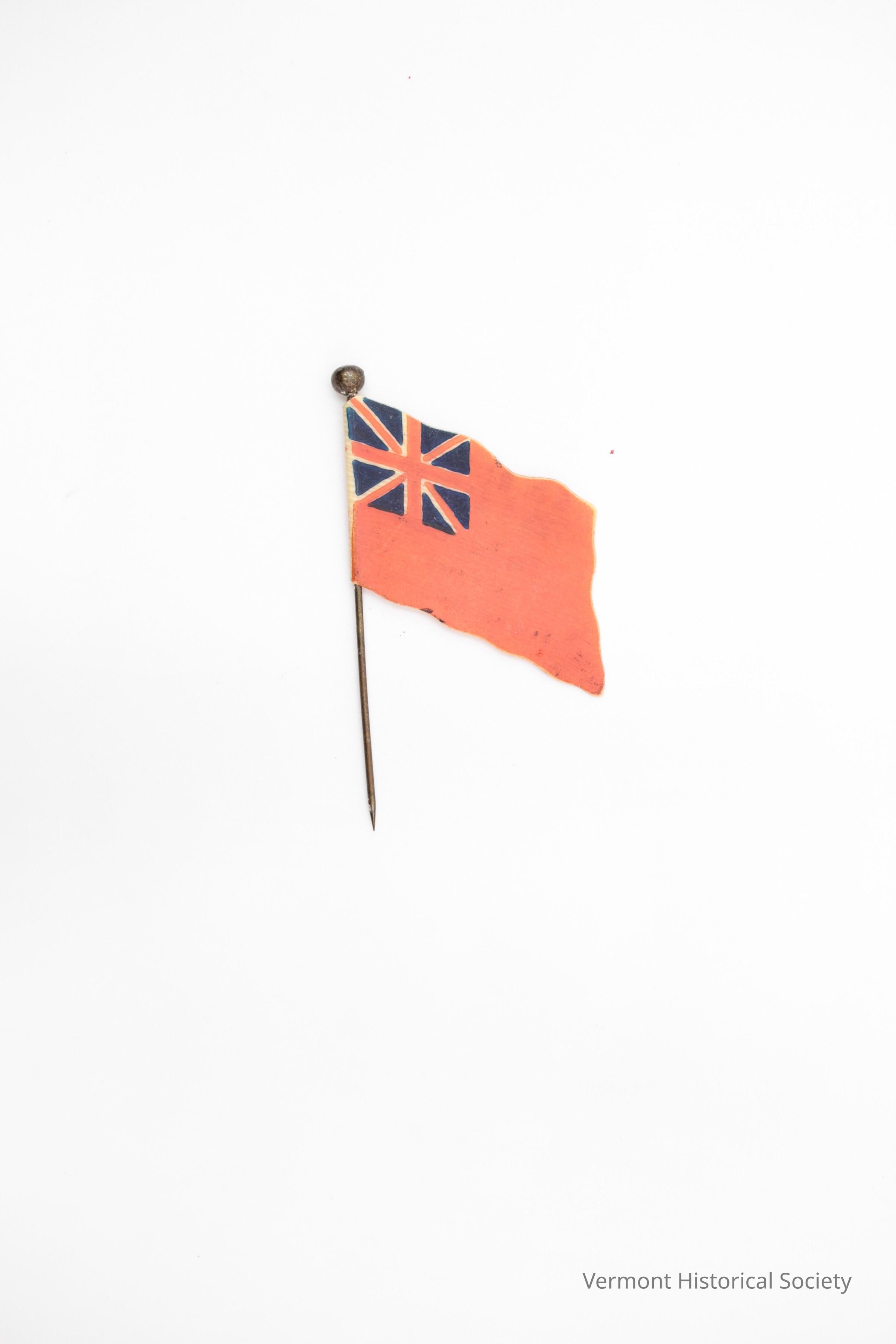 Small pin consisting of a plastic Canadian flag and a straight pin. The back of the pin is printed with the inscription, "THE 2 MACS CO. / The Busy Tailors / OTTAWA / BANK AND SPARK STS."Acquisition