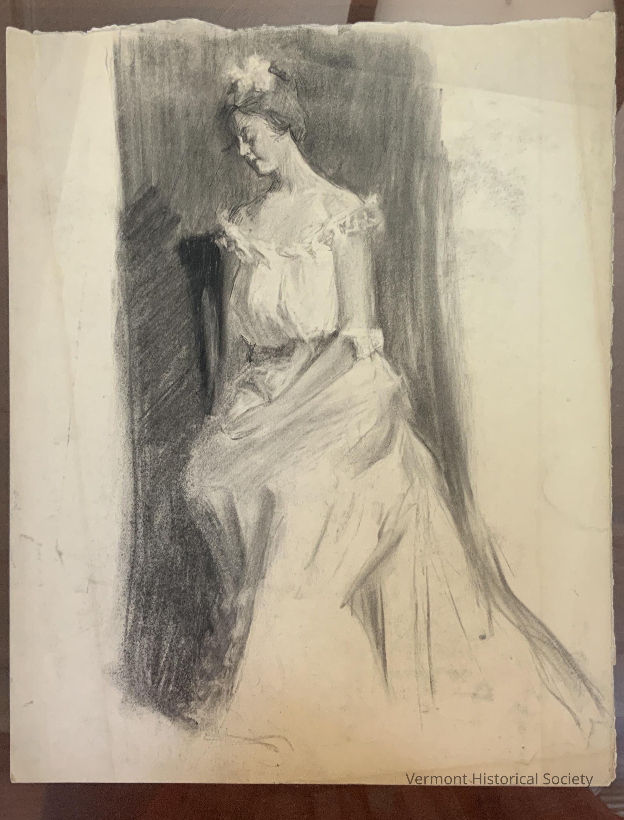 A graphite drawing of a woman in a long dress sitting in a chair against a dark background. She has her hair in an updo and has a flower in her hair. The drawing is very smudged and has few definite reasons, angular lines. It is unsigned and undated.Type of Drawing