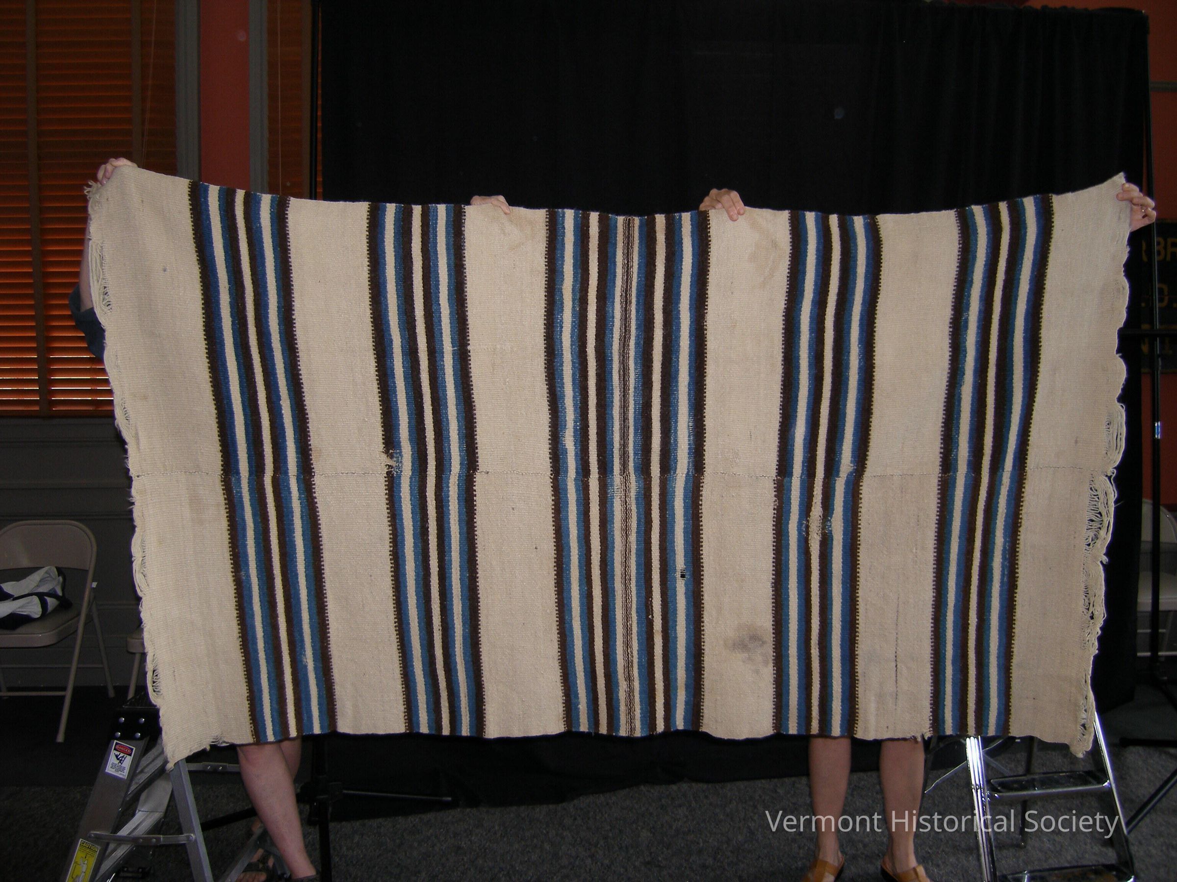 Wool blanket woven in stripes of white, blue, and brown. The blanket is made from two strips of cloth, seamed together down the center.Context