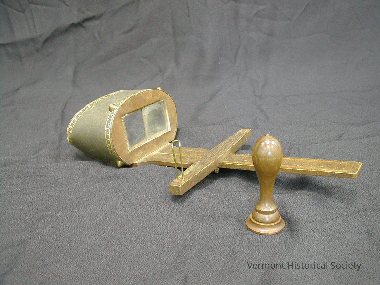 Stereoscope with broken off turned wooden handle. The stereoscope consists of a brass-covered oval section with glass lenses and an adjustable base for holding stereo view cards.
