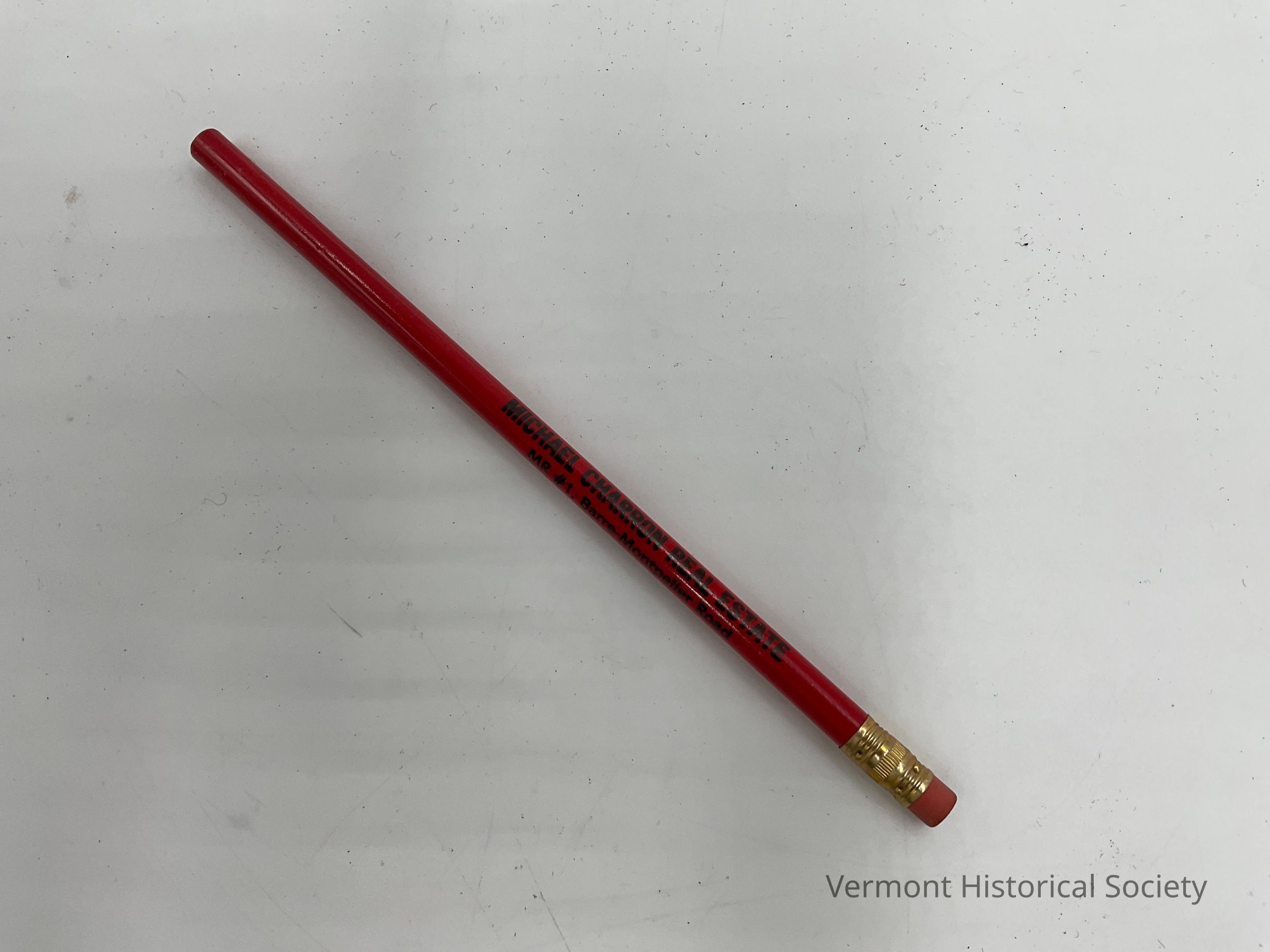 Red pencil with erase that has never been sharpened. Printed in black on the pencil is an advertising message: "Michael Charron Real Estate, MR #1, Barre-Montpelier Road, (802) 476-6665, 'Call us - You'll be moved."Context