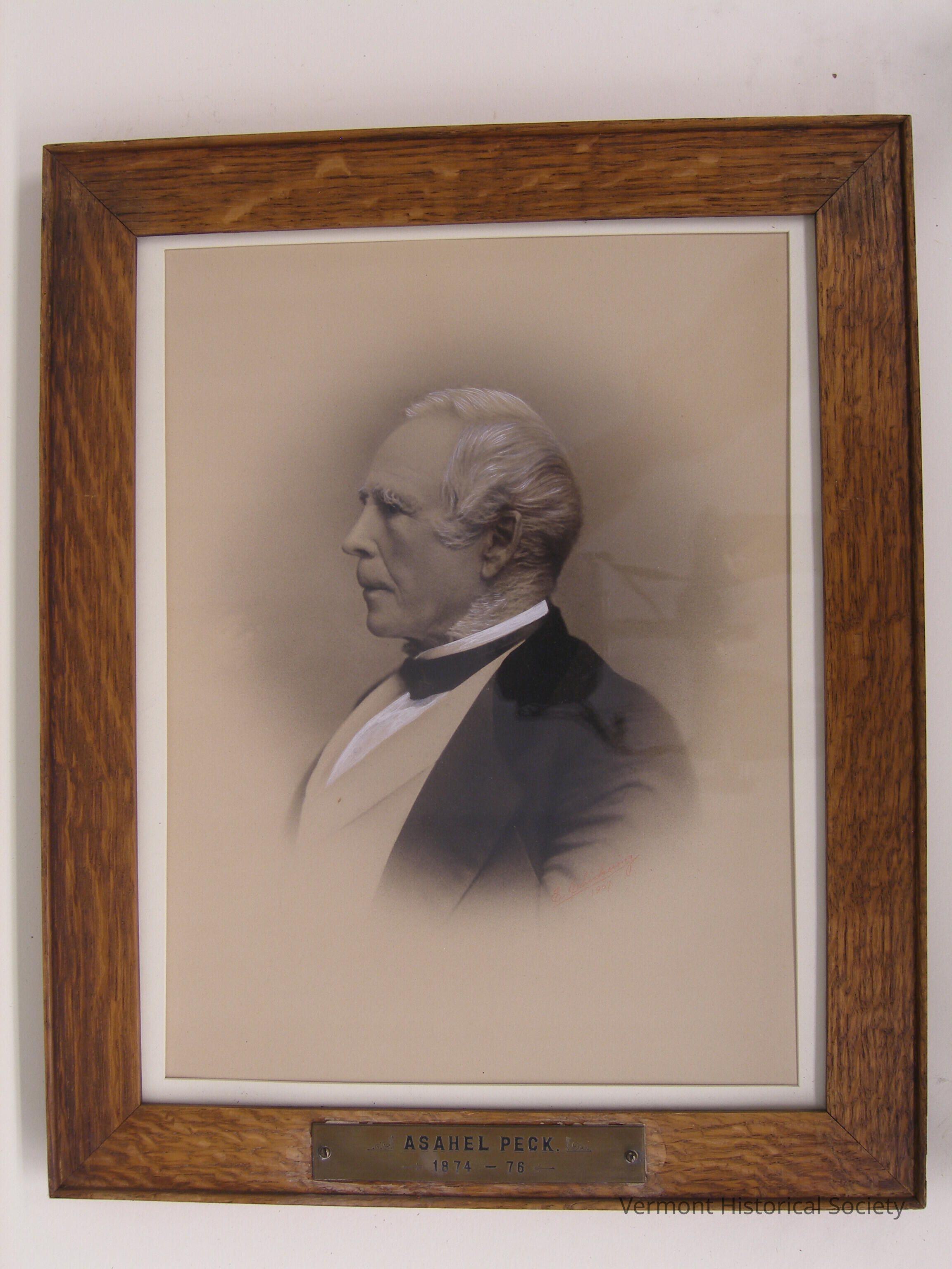 Print showing a man wearing a black suit jacket and tie, a cream vest, and a white shirt facing to the left. He has white hair brushed forward on his head, and hair on his neck. The print is framed in a wooden frame beneath white matboard. A metal plaque at the bottom center of the frame reads, "ASAHEL PECK 1874 - 76".